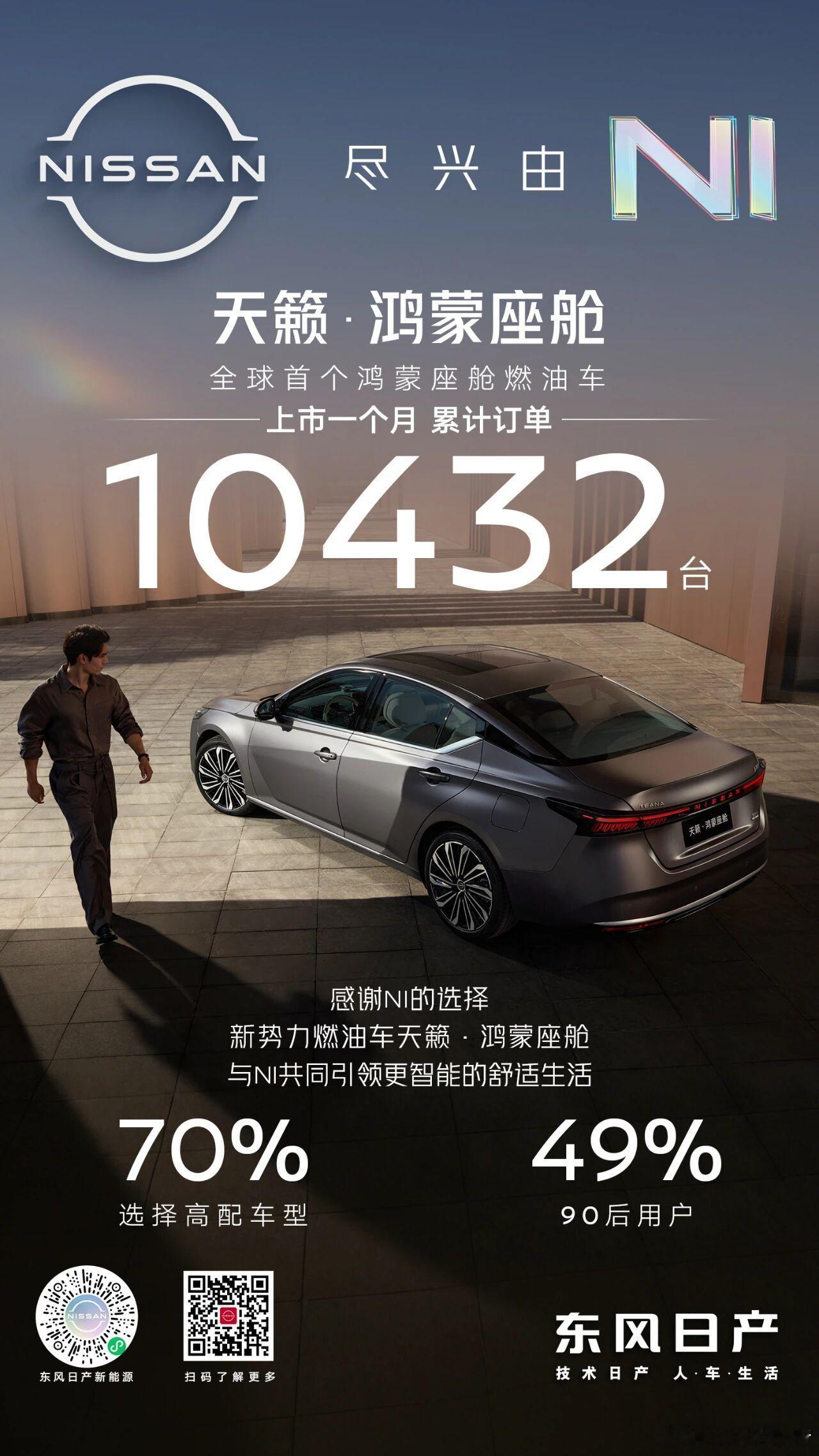 天籁·鸿蒙座舱上市一个月订单破万12月22日,东风日产官宣,全球首个鸿蒙座舱燃油车“天籁·鸿蒙座舱”上市1个月累计订单10432台,在合资燃油中型轿车里属于非常亮眼的表现。该车于今年广州车展首日正式上市,共推出4款车型,售价区间为13.99-16.79万元,上市限时价12.99-15.79万元。汽场全开天籁12.99万起全系标配鸿蒙座舱5天籁鸿蒙座舱东风日产