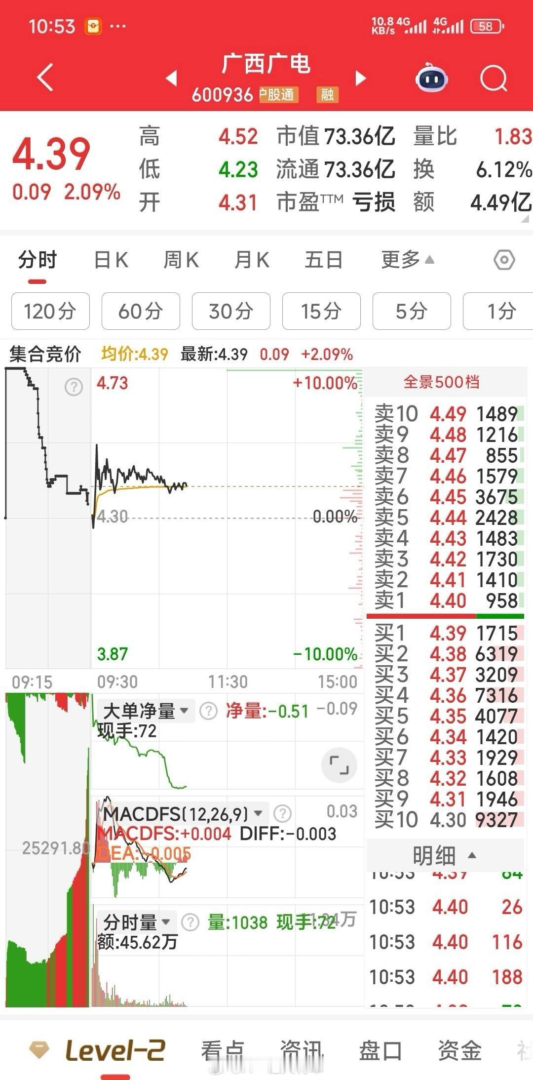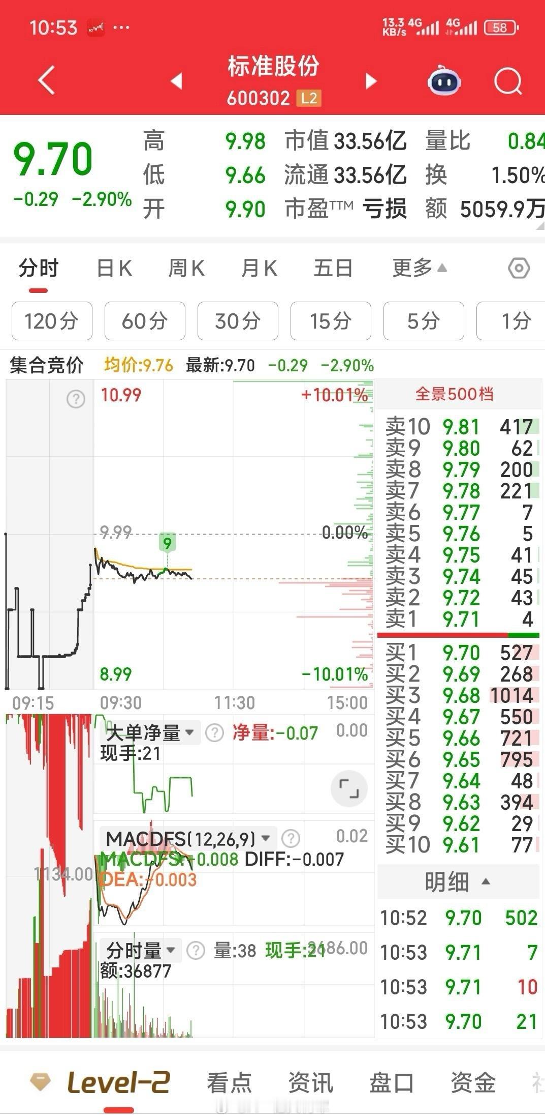 9.71元暂减标准股份,4.39元加仓广西广电。我认为短线广西广电会发力更快,希望主力下午发力封N型第二板。