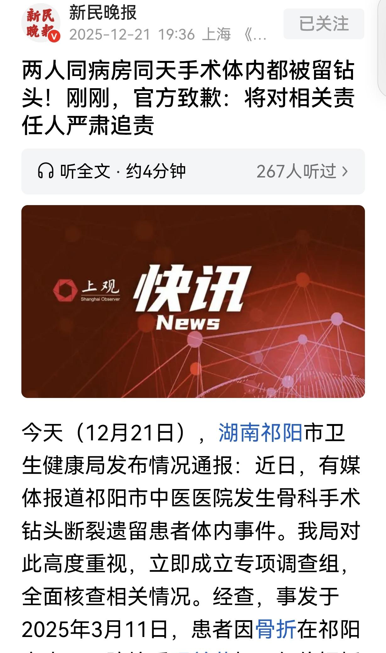 湖南祁阳,一男子做骨科手术,手术的右腿却一直疼,他跑了5个月的医院,才惊讶的得知,医生把钻头打断了,直接掉在他的骨缝里,竟没告知家属,而让他难以置信的是,跟他同病房同一天手术的病友,体内也被留下了钻头! 2025年3月11日,周先生因为跌到受了伤,在某医院做踝关节切开复位钢板内固定术。 男子躺在手术台上,他既紧张又期待,谁做手术都害怕,但打麻药也不疼,就是心里紧张,咬咬牙就挺过去了,谁让自己那么不小心呢,等他恢复健康,就能健步如飞了,这么一想,他又感到很欣慰。 手术进行的很顺利,周先生也出院回家休养,可他很快就觉得不对劲了,他手术都做完了,做了手术的右腿疼个不停,竟然比没做手术前还疼,这就不正常了。 周先生疼痛难忍,吃不下饭睡不着觉,只能去医院找医生问个究竟,可每次都没找到问题所在。 就这样,周先生被疼痛折磨了5个多月,这期间,他一次次去医院,想知道什么原因,最后竟然被告知,医生给他做手术时,竟然把钻头弄断了,而断了的钻头,却被医生疏忽大意,留在了他的骨缝里。 而让周先生倒吸一口凉气的是,倒霉蛋不止他一个,跟他同一病房的病友,和他同一天手术,竟然跟他遭遇一样。 可把两个人气坏了,他们不依不饶,要求医院给个说法,但每次都无功而返。 在周先生看来,自己不能白白受罪,这个事故必须得给他一个处理结果,而且什么时候出结果,也得给他一个具体时间,不能三两天头打发他。 直到2025年9月15日,周先生终于拿到给他做手术的人员签的证明,他们承认了确实在周先生体内遗落钻头,也没告知家属。 相关部门也承诺,会对医院处以警告和罚款30000元,相关医生也会做出行政处罚。 同时,周先生和他的病友,可以通过医疗鉴定,明确医院的责任和他们的损失,医院承担应有的赔偿责任。 事后,相关部门组织医院和周先生进行调解,但双方没达成一致,建议周先生走法律途径维护自己的合法权益。 患者是去治病,不是去被迫害,出问题不解决还故意隐瞒,给病人造成那么久伤痛 应该罪加一等! 有人调侃,从文章来看,患者骨头硬,导致了钻头断裂,假如患者骨头没有这么硬,就不会发生这种事故,对患者应该严肃追责,要求赔偿钻头。 轻飘飘给予警告罚款3 万,这就是所谓的处理方式,听着就让人后怕,如果处理不好类似问题还会发生,必须要严肃处理相关人员。 人命关天!同时发生两例钻头留体内的恶劣事故,不能以致歉这样轻描淡写!追究相关人的责任,对涉事医生依法从严从重处置! 患者周先生上医院是去治病的,不是去遭罪的,结果倒好,医生手术时把钻头弄断在骨头缝里,还瞒着不告诉家属,这哪是治病救人,简直是草菅人命! 周先生多倒霉啊,手术完右腿疼得比术前还厉害,疼了五个多月,跑医院无数趟,结果才知道是体内留了钻头。 更离谱的是,同病房同天手术的病友也遭遇了同样的事!这哪是个例,分明是管理混乱、医生操作失职! 最气人的是,医院一开始还躲躲闪闪,不肯给个说法。患者疼得吃不下睡不着,医院却轻描淡写地打发人,这不是拿病人的健康当儿戏吗? 直到事情闹大了,医院才被警告罚款三万,对医生做个行政处罚。三万块对医院来说算个啥?这处罚力度也太轻了吧!要是每次医疗事故都这么处理,那医生的责任心还怎么保证?患者的安全还怎么保障? 好在相关部门有作为,让患者做医疗鉴定,明确责任和损失,医院该赔就得赔。但调解没达成一致,那就走法律途径,绝对不能让患者吃亏! 这事儿也给所有医院和医生敲了个警钟:手术不是儿戏,患者的生命健康容不得半点马虎!出了事故就得勇于承担,该赔偿赔偿,该处罚处罚,别想着隐瞒糊弄。 最后想说:患者信任医院,医院就得对得起这份信任!别让“治病救人”变成“事故”,否则,谁还敢上医院? 《医疗事故处理条例》第2条规定:医疗事故是指医疗机构及其医务人员在医疗活动中,违反医疗卫生管理法律、行政法规、部门规章和诊疗护理规范、常规,过失造成患者人身损害的事故。 医院在手术中违反骨科手术规范,如未清点器械、未通过影像检查确认无残留,导致钻头断裂遗留在患者体内,属于“过失造成人身损害”,直接构成医疗事故。 同时,医院隐瞒事故5个月的行为,违反《民法典》第1218条关于“医疗机构需对诊疗过错承担责任”的规定,构成过错推定。 钻头断裂属操作失误,但未及时取出且未告知患者及家属,属于二次违规。 医院辩称“计划后续处理”却未告知,导致患者长期疼痛并延误治疗,过错程度加重。 对医院罚款3万元属行政处罚,符合《条例》责任条款。 患者可通过医疗鉴定主张赔偿:包括后续手术费、误工费、精神损害赔偿等,因医院隐瞒过错导致损害扩大,赔偿金额应相应提高。 医疗事故中,隐瞒行为将直接推定医院全责。患者应及时通过医疗鉴定固定证追究民事赔偿。 关注@灋律盐究员 学法辩是非,用法止纷争。