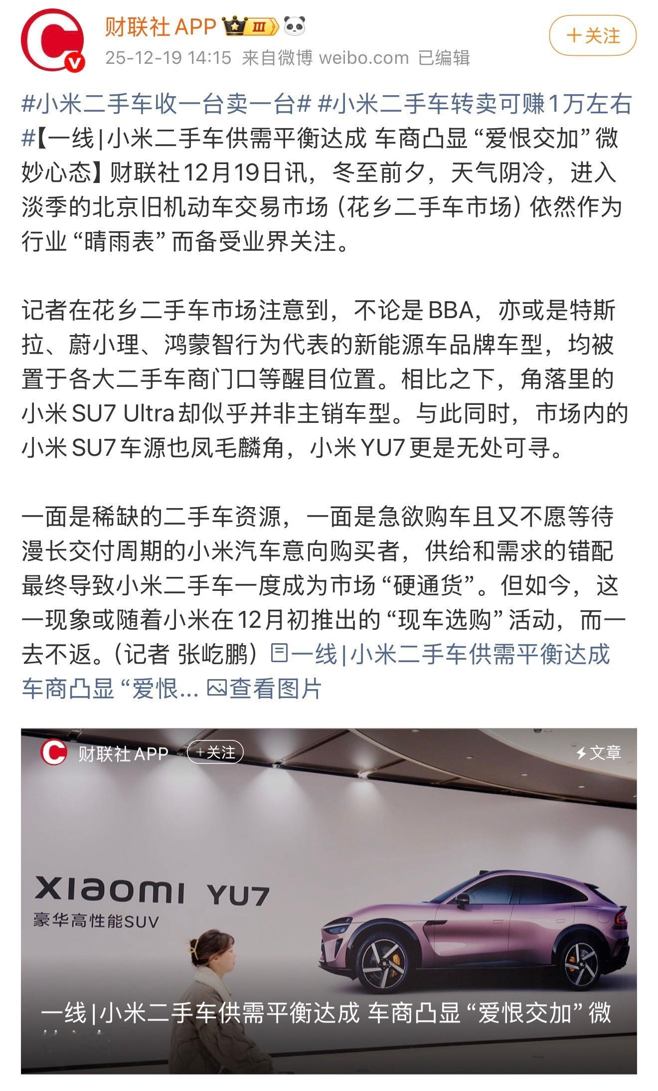 小米二手车收一台卖一台小米二手车转卖可赚1万左右物以稀为贵,小米这车是真火。这两天有一个知名的二手平台开通了线下的二手车商城,里面特斯拉、小米、理想都单独开辟了板块。和我经常合作的二手车贩子也说这玩意真是硬通货,卖的是真好。