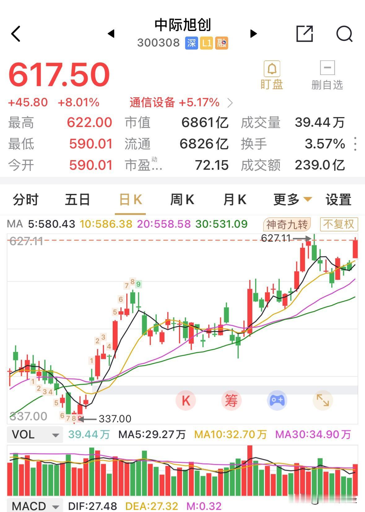 中际旭创又大涨8%,逼近刚创下不久的新高了。中际旭创一手6.0万元多的个股,就这样的估计又要创下新高,究竟是哪路资金在反复拉升? 中际旭创目前近7000亿元的市值,今日成交金额又超过200亿元,市场热度确实非凡。 这要是算力概念哪天退潮了,光模块板块真不知道会发生什么事情。 看看就好,参与的风险远大于收益。 个人观点,勿作操作建议。