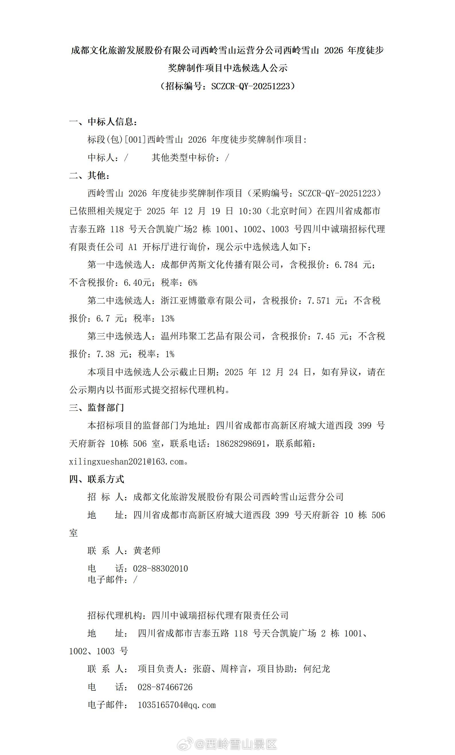成都文化旅游发展股份有限公司西岭雪山运营分公司西岭雪山2026年度徒步奖牌制作项目中选候选人公示