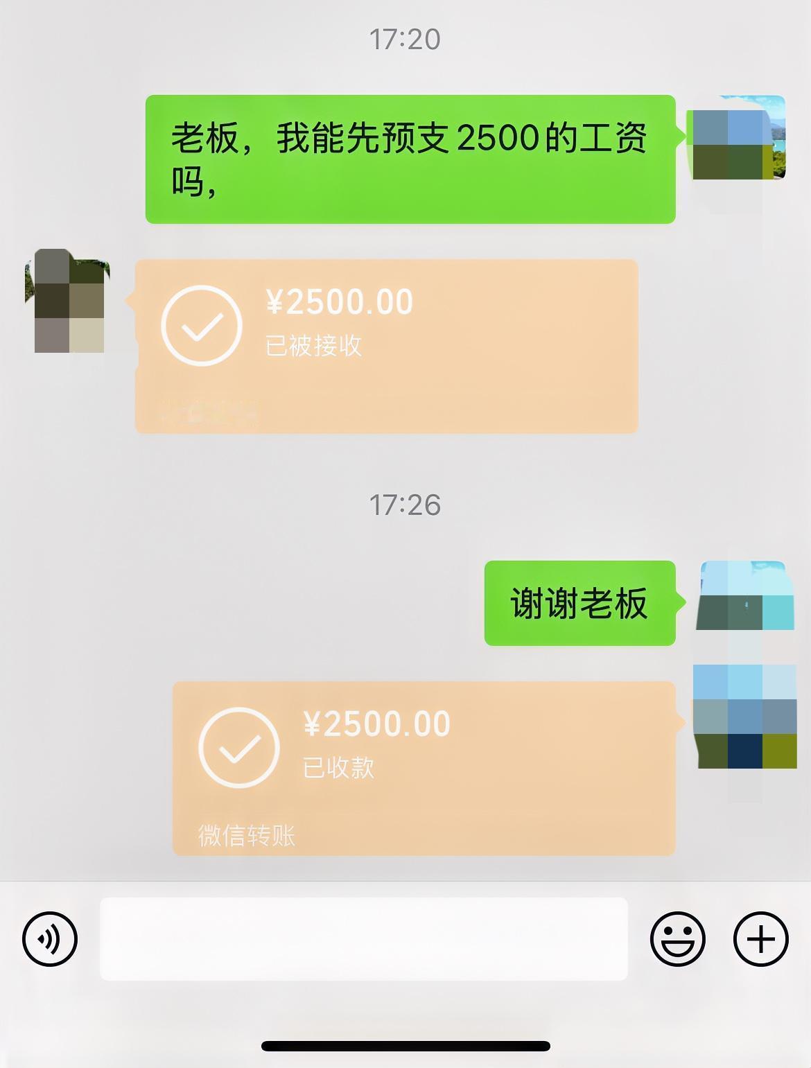 和老板预支工资,没想到老板二话没说,直接就转了过来了,什么都没问, 其实刚发信息过去的时候还挺紧张的,怕老板不回,或者说不能什么的,发完信息之后把手机放一旁,过了好一会才去看微信有没有信息,结果打开一看,直接是转账,那一刻心里蛮激动的[呲牙]