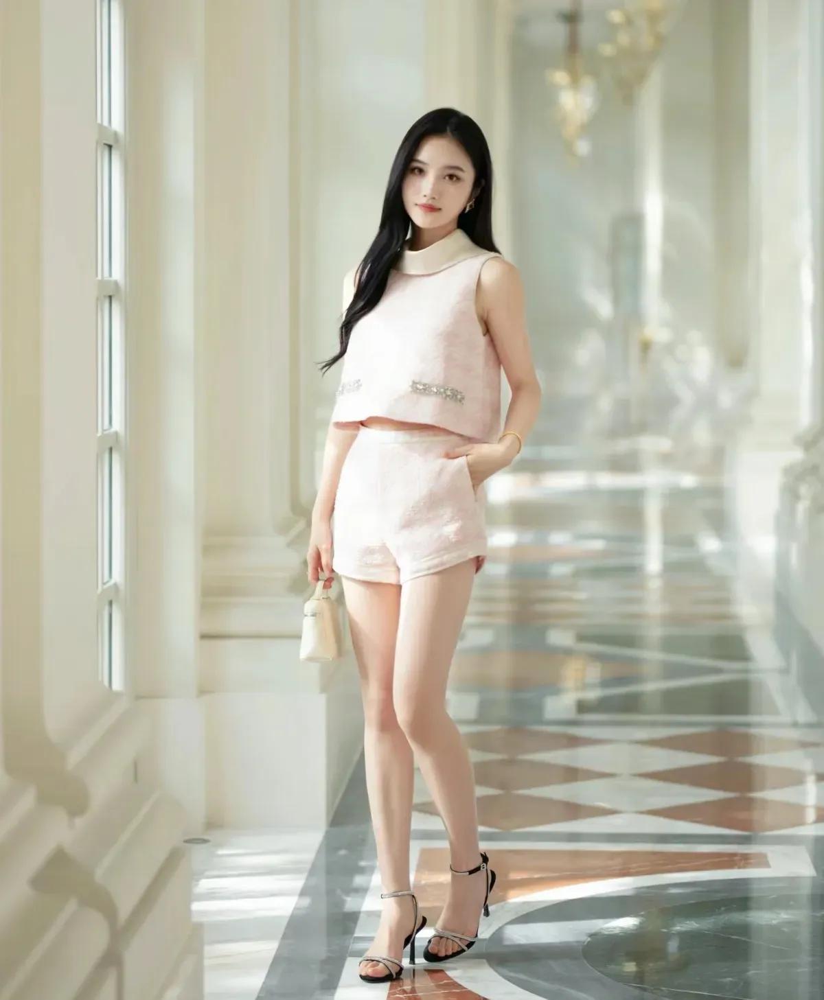 这套穿搭是甜酷精致的浅粉小香风套装,把少女感和轻奢质感融合得很出彩。浅粉色无袖短款上衣+同色系短裤的套装自带甜美元素,粗花呢材质+水钻装饰强化了轻奢精致感,短款版型利落显腿长,适配春夏轻社交场合。 浅白小包柔和清新,与浅粉调呼应;银色高跟凉鞋精致亮眼,平衡了套装的甜腻感,让造型更显轻熟利落。能充分展现穿着者甜酷精致的少女魅力。穿搭小香风套装 浅粉色穿搭