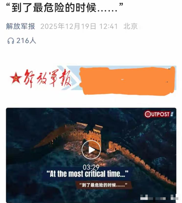 这个信号不简单——做最坏准备! 12月19日,军报平台发布消息,只有短短几个字:“到了最危险的时候......”! 说白了,军报这句简短却分量千钧的话,根本不是随便发的感慨,就是给全体中国人敲的警钟,明明白白提醒我们:现在内外隐患已经堆到了临界点,再抱有任何幻想都可能出大问题,唯有咱们所有人凝聚一心,把内部的隐患清理干净,把外部的威胁稳稳顶住,才能安然过关。 大家心里都清楚,这些年外部的麻烦就没断过,最近更是越来越密集,明显到了图穷匕见的地步。就说台海这边,军报发声前后,日本政客一批接一批地窜台,还专门要和“台独”势力见面,之前日本首相甚至还妄称“台湾有事”就是日本的危机,明摆着是想插手我们的内政。 更过分的是美国,刚批准了上百亿美元的对台军售,全是些能把台岛武装起来的先进武器,不是小打小闹的“切香肠”,而是明火执仗地往我们核心利益上捅刀子。 再看周边,有些国家跟着美国起哄,搞什么联合军演、供应链围堵,试图把我们的发展空间压缩掉。这些外部势力凑到一起,不是各自为战,更像是一张慢慢收紧的网,用各种挑衅消耗我们的精力,就是想阻滞我们的发展脚步。 除了外部的这些明枪暗箭,咱们内部的隐患也不容小觑,早就到了必须正视的临界点。这些年经济发展快,但也积累了不少结构性问题,比如之前一直依赖的出口和投资驱动模式,现在遇到了瓶颈,外部需求收缩,内部消费又没完全拉起来,不少企业经营压力大,就业市场也面临挑战。 还有些地方为了短期效益,曾经忽视了环境治理,现在绿色转型的压力越来越大,这些都是需要花大力气解决的问题。更重要的是,社会上还有些不稳定的小苗头,比如偶尔出现的安全事件、一些领域的利益固化,这些问题看似不大,但在外部压力加大的时候,很容易被放大,影响内部的团结。 可能有人会觉得,“最危险的时候”是不是有点夸张?其实一点都不。军报从来不会随便制造恐慌,它说的危险,不是说明天就会有战火,而是这种内外交织的压力已经到了临界值,再放任不管或者掉以轻心,很可能会出大乱子。 外部势力就是看透了我们想安心发展的心思,才敢一次次突破底线,他们以为我们会为了和平忍气吞声,可他们忘了,我们的克制从来不是软弱,而是珍惜发展的机遇。现在军报拉响警报,就是要让所有人清醒过来,丢掉“忍一忍就过去了”的幻想,准备好应对最坏的情况。 而应对这一切的关键,就在于“凝聚一心”这四个字。清内忧,不是靠某一个部门的努力,需要我们每个人配合。企业安心搞创新,提升竞争力;普通人做好自己的本职工作,理性看待发展中的问题;相关部门拿出魄力解决民生难题、打破利益固化,让大家都能共享发展成果,这样内部才能拧成一股绳。 定外患,更需要全国上下一条心,军队枕戈待旦守护疆土,我们普通人坚定支持国家的决策,不被外部的舆论炒作带偏,不被分裂势力的阴谋蛊惑。之前我们能在各种挑战中走过来,靠的就是这种万众一心的凝聚力,现在到了最危险的时候,这份凝聚力更是我们最坚实的底气。 军报那几个字后面的省略号,其实藏着所有中国人都懂的话:丢掉幻想,准备斗争。这不是在煽动对立,而是在呼唤清醒和坚定。和平从来不是求来的,是靠实力和团结捍卫来的。 现在内外隐患到了临界点,我们没有退路可走,唯有凝聚一心,把内部的问题解决好,把外部的威胁挡回去,才能闯过这道关,迎来真正安稳的发展局面。 每个中国人都该明白,这时候不是置身事外的时候,每个人的努力都在为国家的安稳添砖加瓦,只有心往一处想、劲往一处使,才能安然度过这个最危险的阶段。
