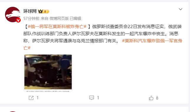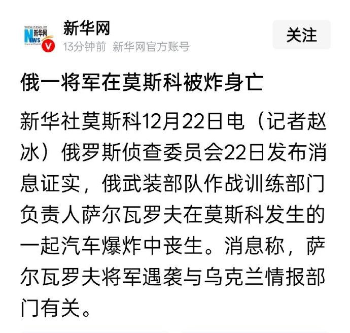 最新消息!俄罗斯萨尔瓦罗夫将军被炸身亡! 在12月22日当天,多家媒体报道,俄罗斯萨尔瓦罗夫将军被炸身亡,据悉,萨尔瓦罗夫将军在莫斯科发生的一起汽车爆炸中丧生,这辆汽车还是他自己的,当时发生爆炸的时候,萨尔瓦罗夫将军还踩刹车了,可惜的是萨尔瓦罗夫将军身负重伤,下肢多处弹片伤和骨折。他在医院去世。随后有消息称萨尔瓦罗夫将军遇袭与乌克兰情报部门有关。不得不说在战场上不一定能够杀死这位将军,可是却遭受暗算。不知道什么原因,几乎都是俄罗斯发生这样的事情,但从没有听说过有乌克兰的高级军官被暗杀的。 其实在今年4月25日左右,俄军总参谋部作战总局副局长莫斯卡利克中将也在莫斯科郊区的类似袭击中殒命。看来在俄罗斯这个国家,乌克兰的斩首行动也暴露俄本土安防漏洞,加剧民众对政府反恐能力质疑。关键这个事情不是一次两次了,俄罗斯应该提高警惕了,要不然说不定以后还有类似的事情发生。