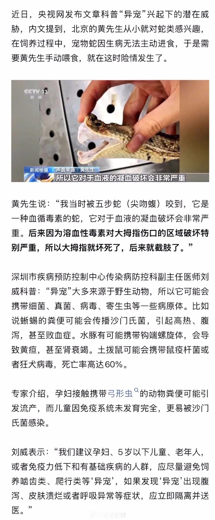 【男子养五步蛇当宠物,蛇生病无法主动进食,男子用手喂养被咬后截肢,专家提醒→】北京男子养五步蛇被咬截肢警示 近日,央视网发布文章科普“异宠”兴起下的潜在威胁,内文提到,北京的黄先生从小就对蛇类感兴趣,在饲养过程中,宠物蛇因生病无法主动进食,于是需要黄先生手动喂食,就在这时险情发生了。(金华晚报、央视网)同城热点创作计划