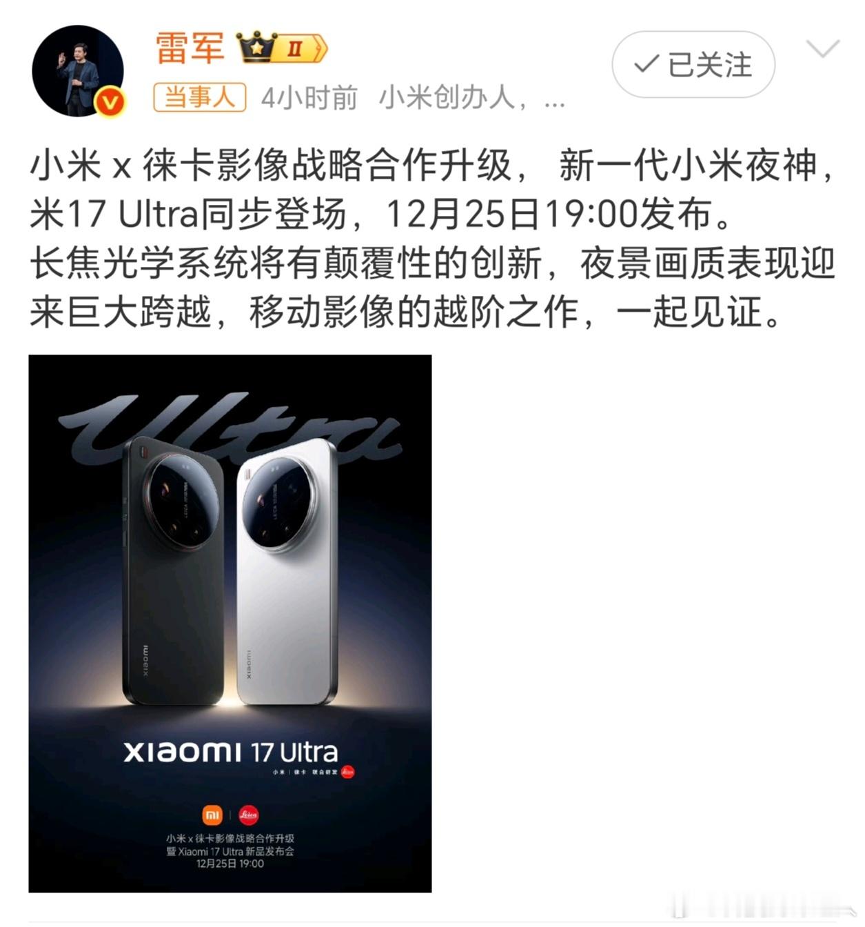 雷军称一起见证小米17Ultra小米17 Ultra定档圣诞夜,感觉这次雷总给出的惊喜很大,升级大跨步,之前看小米15 Ultra拍的夜景就很顶,这次夜神称号肯定不是白叫的,坐等发布会揭晓长焦到底有多牛!
