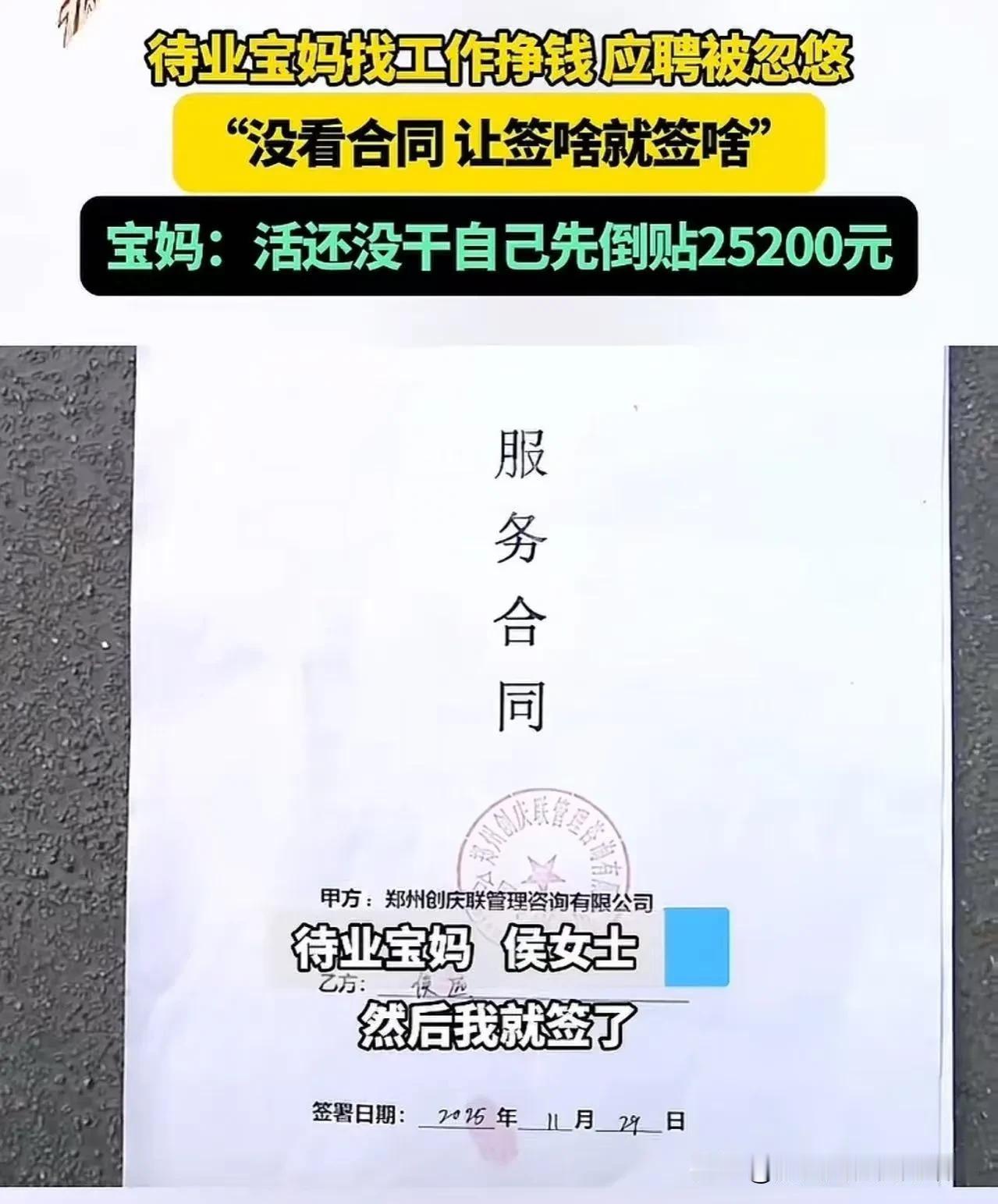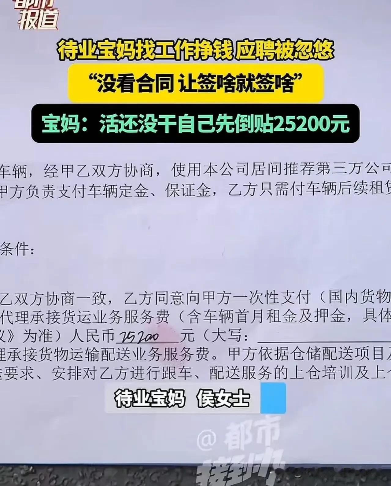 【太坑人!郑州女子应聘司机没上岗先倒贴25200元,“高薪司机”竟是租车打工】 为了补贴家用,她只想找一份踏踏实实的司机工作,却没想到一脚踩进了精心设计的“坑”里。 河南郑州,一名女子在求职平台上看到一则“司机招聘”信息,薪资诱人,工作内容写得也很简单,她想着多赚点钱改善家里生活,便立刻去应聘。 面试时,对方说得天花乱坠: “工资高、活轻松、福利好,只要你肯干,收入绝对可观。” 女子信以为真,在对方的催促下,没有仔细看合同内容,就匆匆签了字。结果,还没正式上岗,她就被要求先交一笔“租车费用”,前后一共掏了25200元。 等她回过神来才发现,这份所谓的“司机工作”,根本不是她想象中的那样—— 她不是给公司打工拿稳定工资,而是先租公司的车,再给公司开车,工资也远远没有当初承诺的那么高。 “没看合同,就是骗人的!”女子气愤地说,“让我租他们的车给他们当司机,工资也没他们说的这么高!” 这起事件暴露出一个常见的求职陷阱: 打着“高薪司机”“轻松上岗”的旗号,实际是让求职者先掏钱租车、买装备、交押金,一旦合同签了,钱进了对方口袋,求职者就很难维权。司机的骗局 应聘司机被骗 司机求职套路 素材来源于网络,侵权删除。