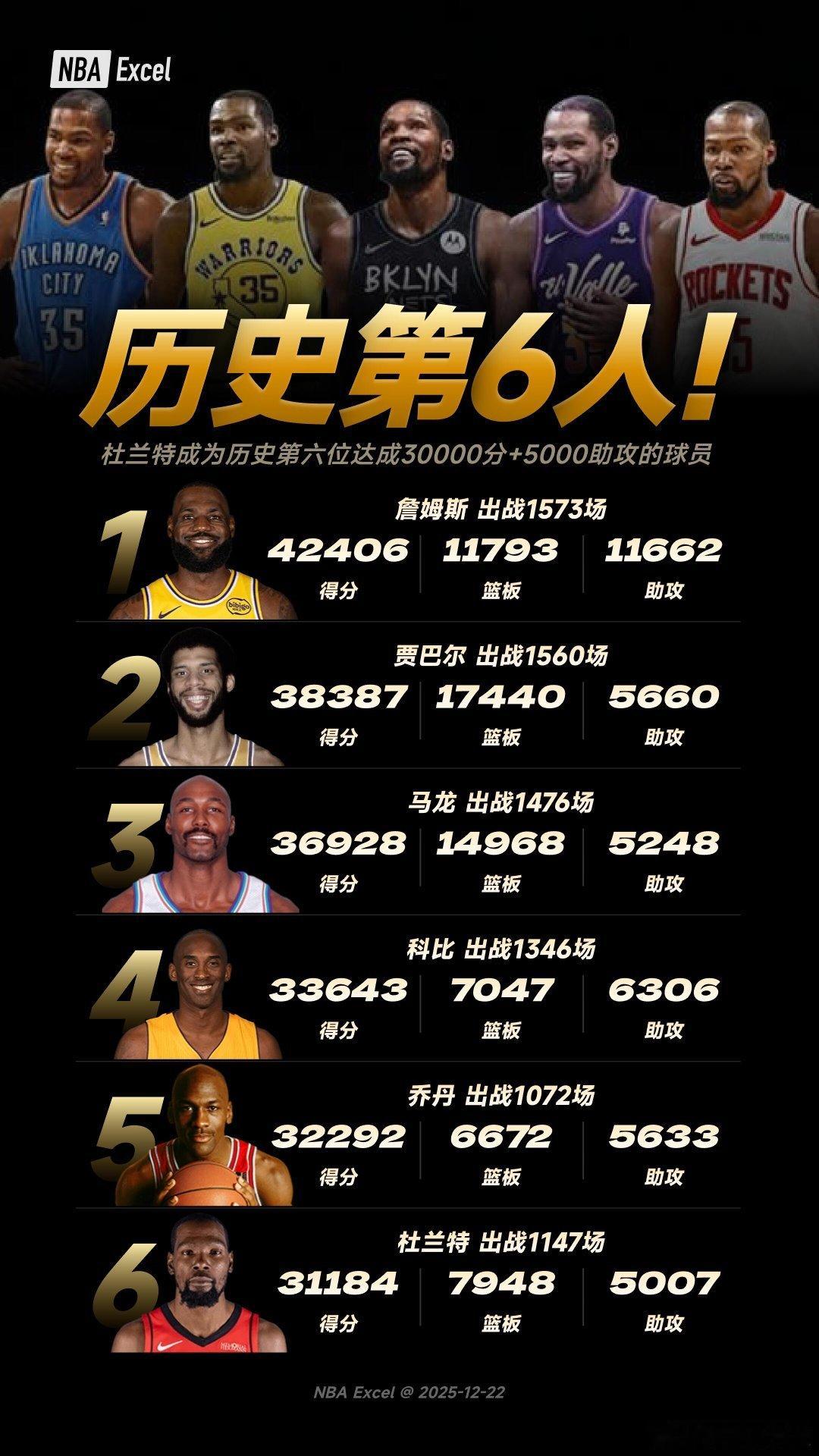 杜兰特30000分5000助5000板传奇殿堂再添一人!杜兰特解锁30000分+5000篮板+5000助攻里程碑,正式跻身NBA历史第六人行列在火箭对阵国王的比赛中,杜兰特达成生涯5000次助攻,就此成为联盟史上第六位同时收获30000分、5000篮板与5000助攻的巨星。此前仅有贾巴尔、马龙、乔丹、科比与詹姆斯达成这一全方位输出成就!更值得一提的是,KD仅用1147场比赛便达成这一里程碑,效率高居历史第三,仅次于乔丹(1072场)与詹姆斯(1102场)。从得分杀手到全能传奇,他仍在书写属于自己的篇章。