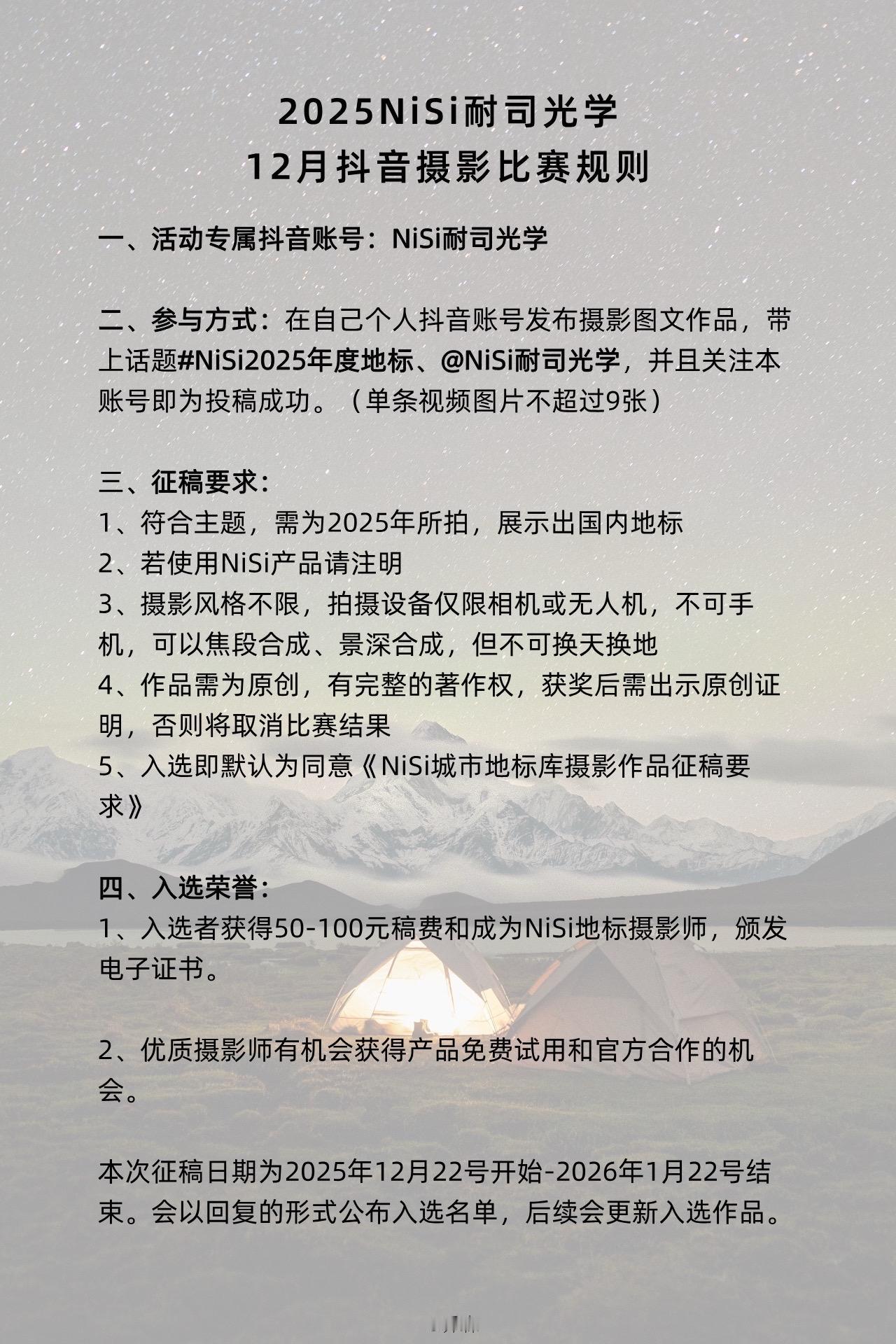 2025年到了尾声,这一年,你按下多少次快门,解锁了多少个新地标呢。用一张图来定格你的2025,你会选哪一张呢?本期征稿主题:2025年度地标!在个人账号发布图文作品,并添加话题NiSi2025年度地标 和艾特本账号即为投稿成功,详细规则参考图二,投稿日期为2025.12.22-2026.1.22。这些地标,不是经过,而是抵达。 风光摄影 摄影比赛 征稿