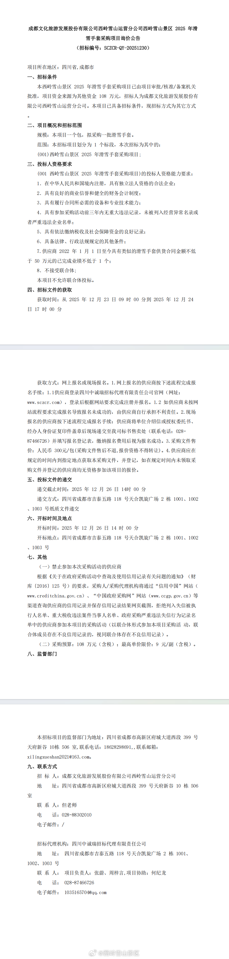 成都文化旅游发展股份有限公司西岭雪山运营分公司西岭雪山景区205年滑雪手套采购项目询价公告