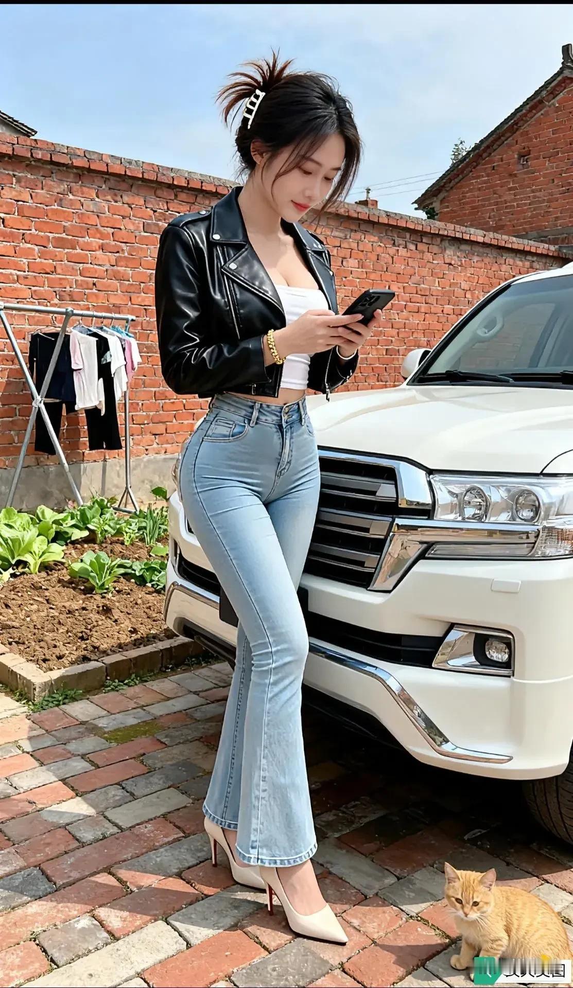 《院隅娇影》 红砖小院沐晴光,倩女依车意未央。 黑袄轻披凝飒爽,蓝衫斜衬露纤长。 云鬟半挽簪星佩,玉指轻划阅锦章。 猫步轻移惊橘猫,莲鞋微踏印砖霜。 畦边菜叶青含露,架上衣裾白映墙。 白车熠熠凝辉彩,秀影亭亭立画堂。 浅笑低眉春暗度,凝神垂目韵清扬。 不须浓黛添妍色,自有风华压众芳。 风拂鬓丝摇碎玉,光浮衣袂漾幽香。 郊居野趣融闲逸,俏影嫣然入醉乡。 一刹温柔留眼底,千般娇美动诗肠。 柴门虽浅藏春色,笑倚芳辰意韵长。