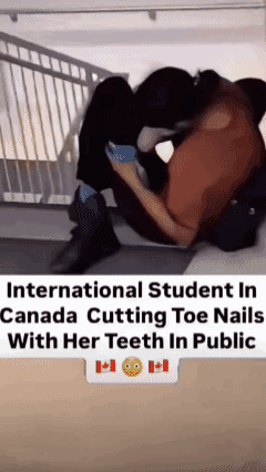加拿大国际学校,被人发现一名印度裔女留学生在楼梯间脱了鞋,退了袜,把腿扳到脸前搁那不知道是在啃脚趾甲,还是在舔舐脚丫子,明明有手有脚应该不能用脚吃饭吧?这是“自足控吗”? 猜猜中国有多少这样的国际留学生和“国际人才”?!