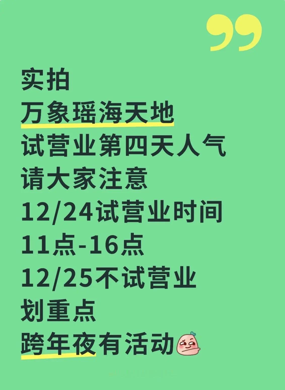 瑶海天地试营业第四天实拍!万象瑶海天地试营业第四天,人气居然还这么旺!😭 本想着周一大家都上班,能让我安安静静逛个够,结果还是人人人!刷到好多小伙伴说要冲平安夜、圣诞节专场,这里必须紧急提醒:平安夜当天16:00就停止营业啦,25号圣诞节全天不营业!千万别跑空!划重点!26号正式营业!据说活动超多,还能过来跨年!真实生活分享计划 足迹记录 开启好运模式一切美好如期而至 vlog日常