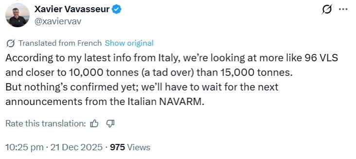 中外舰闻 每天认识一件兵器 烽火问鼎计划 Opex360报道(图1),法国🇫🇷海军总参谋长(CEMM)海军上将Nicolas Vaujour在采访里提到,意大利🇮🇹海军的路线方针是建造更大的战舰,超过10,000吨的“战列巡洋舰”(个人推测实际应该指的是FREMM 2.0导弹护卫舰)和超过14,000吨的(这肯定是指DDX)。而目前法国🇫🇷海军考虑换代“地平线”级导弹驱逐舰(FDA)的仍然是差不多体量的“重型护卫舰”(7,000吨级)。看来法国🇫🇷确实曾和意大利🇮🇹谈过下一代导弹驱逐舰(DDG),根据Naval News创始人兼主编Xavier Vavasseur的说法(图2),法国🇫🇷海军其实是在寻求96单元垂发略超过10,000吨的方案,而意大利🇮🇹海军现在的DDX导弹驱逐舰则是超过15,000吨的“庞然大物”。划重点‼️显然,截止目前为止,没有任何定论,按照Xavier Vavasseur的说法,一切得等意大利🇮🇹海军官方的下一次关于DDX项目的澄清。