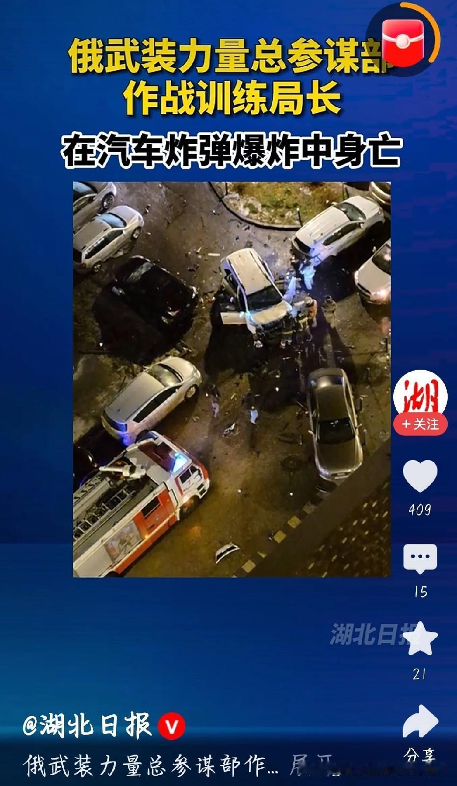 震惊!俄中将在莫斯科被炸身亡,真相直指俄乌暗战 莫斯科街头突发巨响!俄军作战训练局局长萨尔瓦罗夫中将,清晨出门时遭汽车炸弹袭击,底盘下的爆炸装置远程引爆,最终伤重不治。 这事绝非偶然!萨尔瓦罗夫是俄军核心将领,管着前线部队训练和作战部署,是俄乌冲突里的关键人物。俄方直接把矛头指向乌克兰情报部门,要知道这两年已有8名俄高官遇袭,光将军就有6个,作案手法全是精准暗杀。 说白了就是“定点斩首”!乌方靠情报渗透+收买内鬼,摸清将领通勤路线,用专业爆炸装置搞突袭。战场打不过,就往对方首都下黑手,俄乌冲突早就变成全方位暗战。 现在俄方已经立案侦查,后续会不会强硬反击?局势怕是要更紧张了! 俄将军在莫斯科被炸身亡 俄将军莫斯科遇袭 俄乌冲突新动态 为何俄将军会在莫斯科被炸身亡 莫斯科战略调整 俄罗斯伤亡 莫斯科再遭袭击 俄将领遇刺真相 图片截图于湖北日报