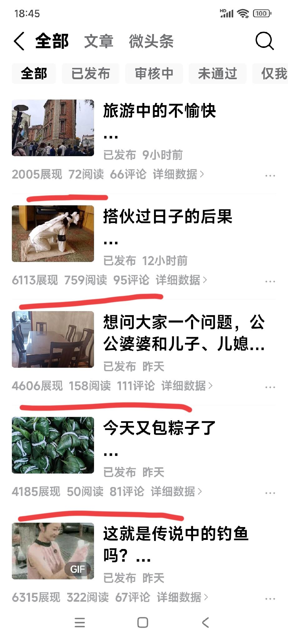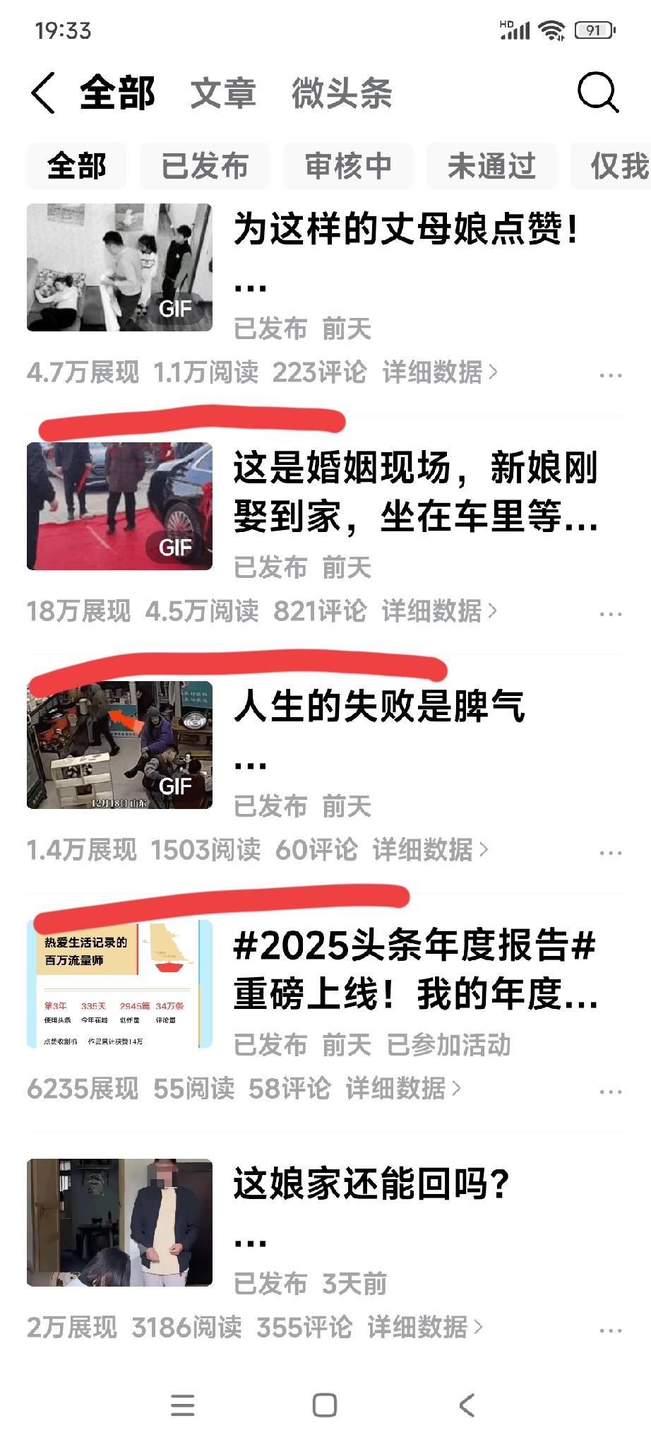 不写了,写不下去了 这两天心情不好,头条写的少了,没有好心情,也没有给友友们评论点赞!在这里给粉丝们说声对不起,真的对不住友友了。 前天有个小爆文,也不算什么小爆文,很正常的,阅读量几万,在我看来,都是正常现象,平常几乎天天都这样。 可到晚上,接到头条系统通知,亲爱的创作者,平台不鼓励表意不明、标题党,编造感强或其它低质创作内容。 我没有标题党,只是看视频写了评论,根据视频动作描写,视频都是在网络上刷到的,如果视频低质,为啥还在网上传?加啥不下架? 现在头条给我限流了,我问了客服,限流多少天?客服回答,他们也不知道。总不能没个期限,限流时间长了,我就不写了,写了也没意思,一天流量几十个。 我每天早上5点开始写,晚上十二点才睡,一天付出十几个小时,每天收益20元左右。限流后一天写多少都没收益,所以打算退出,不再争扎了。 以后有时间看头条,还会给网友们点赞!