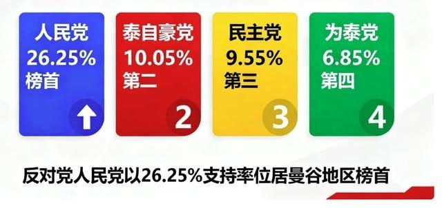 泰国大选曼谷地区民调出炉:那他蓬领导的人民党支持率26.25%,居首位。首相阿努廷领导的自豪党位居第二位,支持率10.05%。民主党位以9.55%的支持率位列第三位。佩通坦所在的阵营为泰党,以6.85%的支持率位居第四。那他蓬还以10.9%的支持率成为“最受期待的首相候选人” 最近泰国国立发展管理学院搞了个针对曼谷两千人的电话调查,从12月15日到19日,主要问大家支持哪个党和谁当总理。结果出来,很多曼谷人还没想好要投谁,但已经表态的那部分,人民党拿了26.25%的比例,排第一。这党是前进党解散后重组的,那他蓬当领袖,靠着年轻人和城市人群的支持,稳稳领先。 紧跟着是现任总理阿努廷的自豪泰党,10.05%,第二名。阿努廷这党一向在基层有基础,这次在曼谷也还行。民主党9.55%,第三。为泰党只有6.85%,第四,这党以前在曼谷有影响力,但现在明显下滑,佩通坦那边的阵营没拉到多少票。 总理人选上,那他蓬16.95%,最高,阿努廷10.9%,民主党前领袖阿披实9%。为泰党推的朱拉潘才2.25%,落后不少。整体看,近一半曼谷人还没决定投谁,说明大家对现有选项都不太满意,观望情绪重。 这调查反映出曼谷政治风向有点乱。人民党在首都保持优势,靠的是对制度调整的呼吁,吸引了不少对老政党失望的人。自豪泰党作为执政党,靠阿努廷的经验稳住一部分选票,但也没拉开差距。民主党试图靠老牌形象争席位,为泰党则在恢复元气上费力。 大选定在2026年2月8日,提前投票2月1日。各党已经在备战,曼谷作为重点区域,竞争肯定激烈。人民党早早公布总理候选人名单,那他蓬排第一,想稳住领先。自豪泰党面对压力,阿努廷得靠执政资源拉票。为泰党和民主党也在调整策略,争取中产和传统选民。 现在泰国政局多变,阿努廷上台后解散议会,就是为了提前选举。各党都在拉票,曼谷这块票仓谁拿得多,谁就更有底气。人民党目前在民调里占优,但选民不定因素多,经济问题和民生议题会决定最终走向。投票那天,曼谷人怎么选,会直接影响下届政府格局。总之,这场大选看点不少,大家都在等结果出来再说。