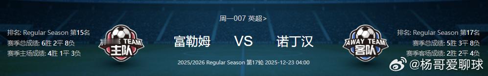 每天的早场和中场赛事杨哥都会在里发放,晚场和半夜场也有不同的场次需要的可以进去看 去交流 里面也要大神会给你门分析 串子组合等。群里的兄弟们已经迎麻了,还没进的兄弟们抓紧了!英超 富勒姆VS诺丁汉森林 诺丁汉森林有望反客为主!富勒姆目前在英超联赛的表现难言理想。历经16轮赛事的鏖战,他们仅仅收获了20个积分,在积分榜上处于中下游的尴尬位置。具体来看,富勒姆在这16场比赛里,取得了6场胜利,然而失利的场次却多达8场。其踢法风格大开大合,进攻时或许能制造不少威胁,但防守端却漏洞百出,后防线缺乏足够的稳定性。近期,富勒姆的状态更是低迷。在英联杯赛事中,他们被纽卡斯尔联轻松击败,无缘进一步晋级。而在最近的4场各项赛事里,他们仅仅在伯恩利身上拿到了一场胜利。诺丁汉森林本赛季的表现同样不算突出,甚至在排名上还落后于富勒姆。目前,诺丁汉森林以5胜3平8负的战绩,位居英超联赛第17位。在客场作战方面,他们的成绩为2胜2平4负,进攻端打进6球,防守端却失守12球,攻防两端的表现都难称出色。不过,诺丁汉森林近期却展现出了截然不同的精神面貌。上场比赛,他们以3比0的悬殊比分大胜热刺,这场胜利犹如一针强心剂,让球队士气大振。凭借这场胜利,诺丁汉森林也迎来了两连胜。富勒姆近期表现不够稳定性,球队在面对劲旅时还是较难抵挡,随着非洲杯的到来,包括伊沃比等三名主力球员的离开,对于球队的影响确实不小。诺丁汉森林近期整体趋势有所走暖,主场也抢得了难得两场胜仗。本场期待诺丁汉森林给出精彩表现。