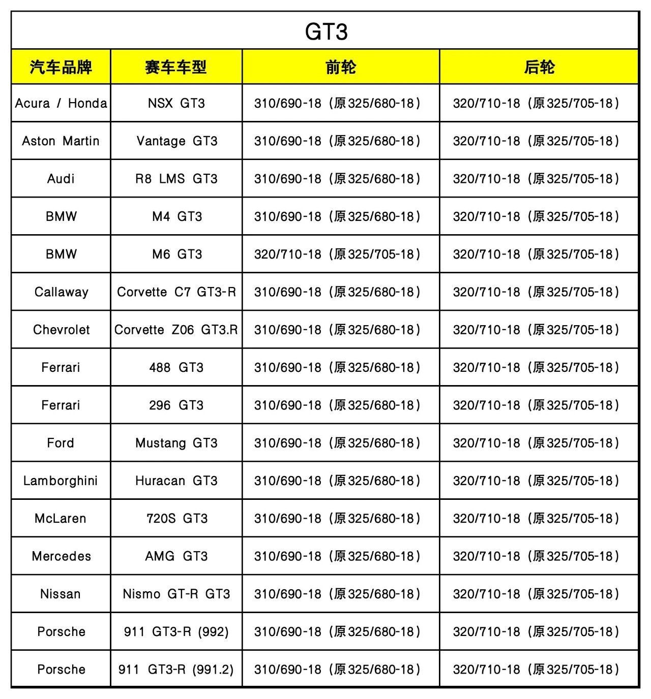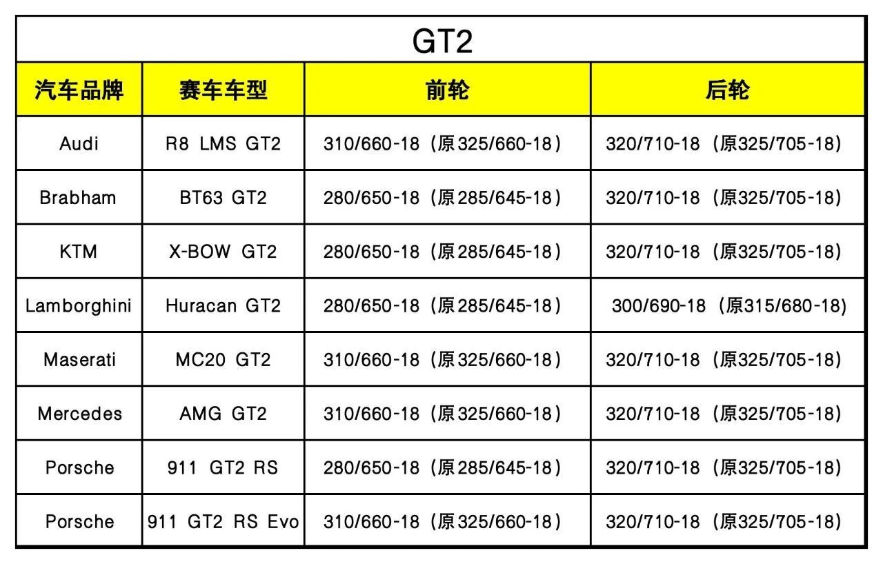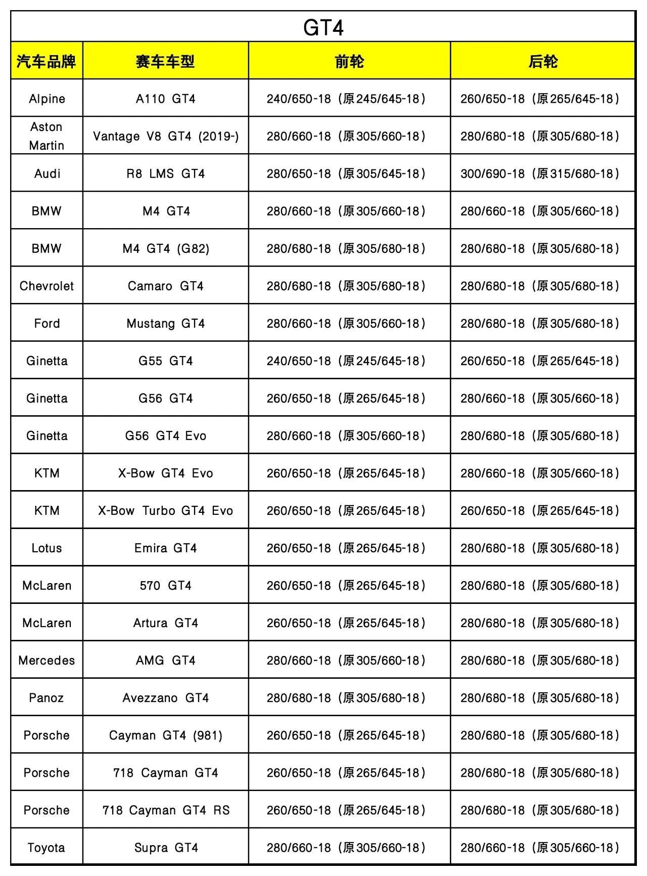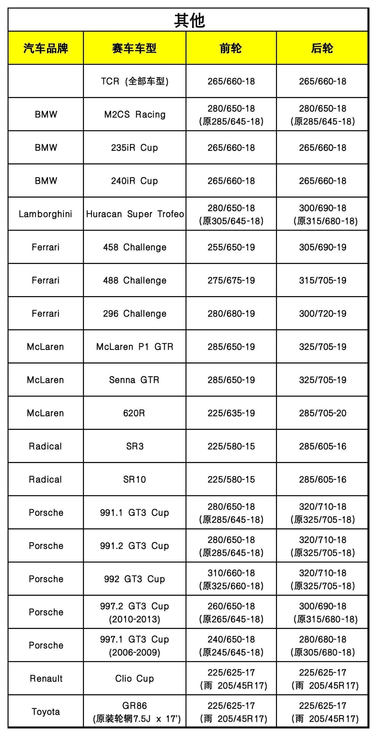 f1 在倍耐力赛车公众号上看到一张倍耐力赛车轮胎主要车型场地赛事干胎使用规格表,