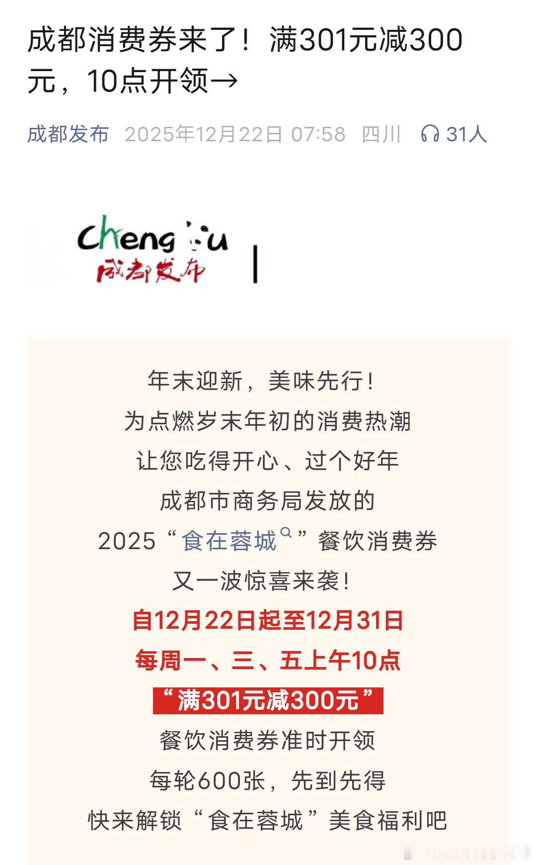 成都这波福利有点大 自12月22日起至12月31日每周一、三、五上午10点“满301元减300元”餐饮消费券准时开领每轮600张,先到先得
