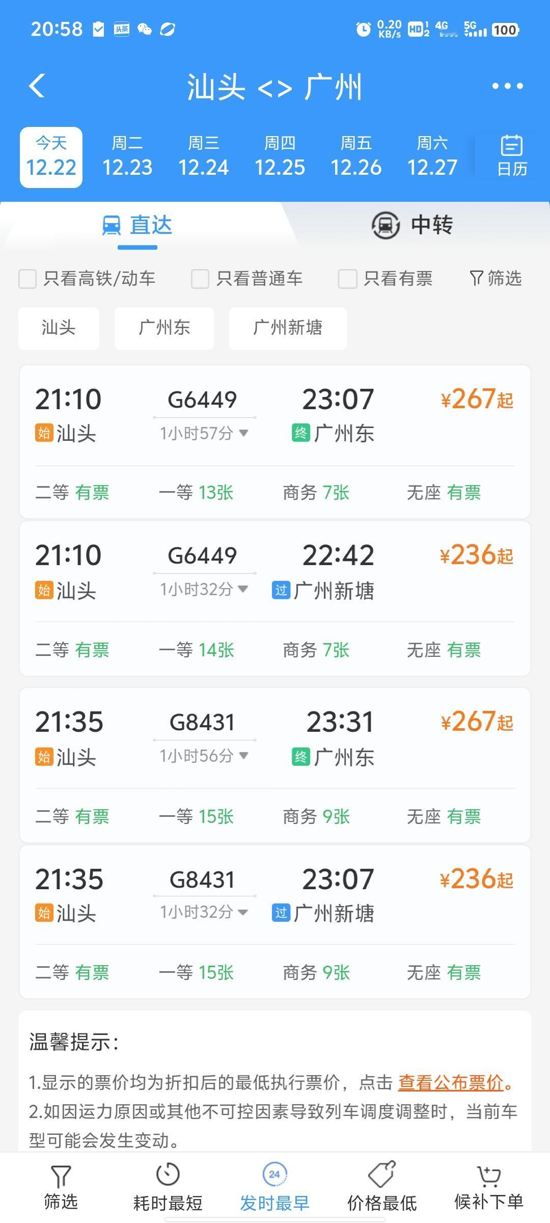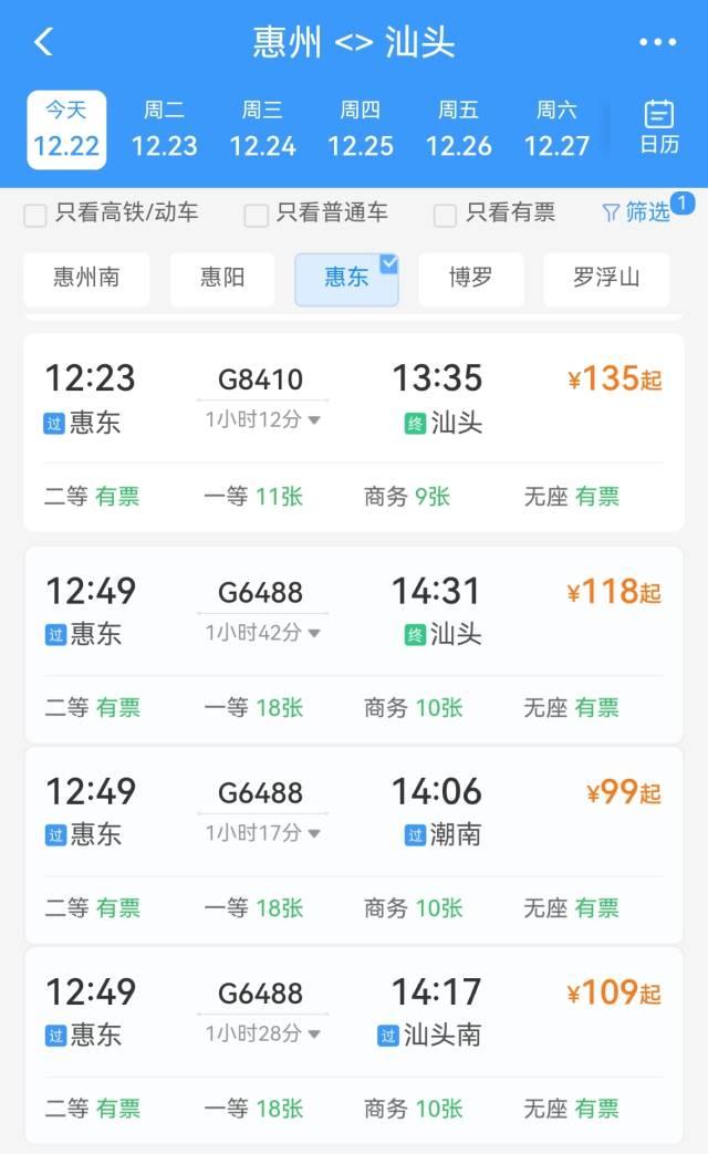 汕头南站至汕头站高铁开通前后通勤时间对比分析 高铁未开通前:自驾需30-40分钟 汕头南站距汕头市区约20公里(不同测量点略有差异),在高铁开通前,自驾是主要交通方式。 行驶时间:约30-40分钟(取决于路况和交通拥挤程度) 路线参考:通过沈海高速(G15)或市区道路→虎头山隧道→中信大道→汕头南站 费用:高速费约20元 这还是仅仅指行车时间,不包含找车位和步行进站时间哦! 今日(2025.12.22)高铁已开通:直达仅需9-10分钟! 汕头南站至汕头站高铁已于今日(12月22日)正式开通运营 ! 运行时间:仅需9-10分钟即可从汕头南站直达汕头站 代表车次: - G6448次:20:04汕头南站发车→20:14到达汕头站,用时10分钟 G6445次:15:00汕头站发车→15:09到达汕头南站,用时9分钟 高铁优势: 不用担心路况拥堵 汕头站内换乘便捷(11台24线的大型枢纽) 原广州东、深圳北至汕头南的48列动车组已全部延长至汕头站终到 总结对比 交通方式 所需时间 费用 便利性 自驾(旧) 30-40分钟 约20元(高速) 需找车位,受路况影响 高铁(新) 9-10分钟 票价约14元直达市区,便捷准时 建议:从今天开始优先选择高铁出行,省时省力,享受"海底穿行使者"(汕头湾海底隧道9781米)的独特体验!