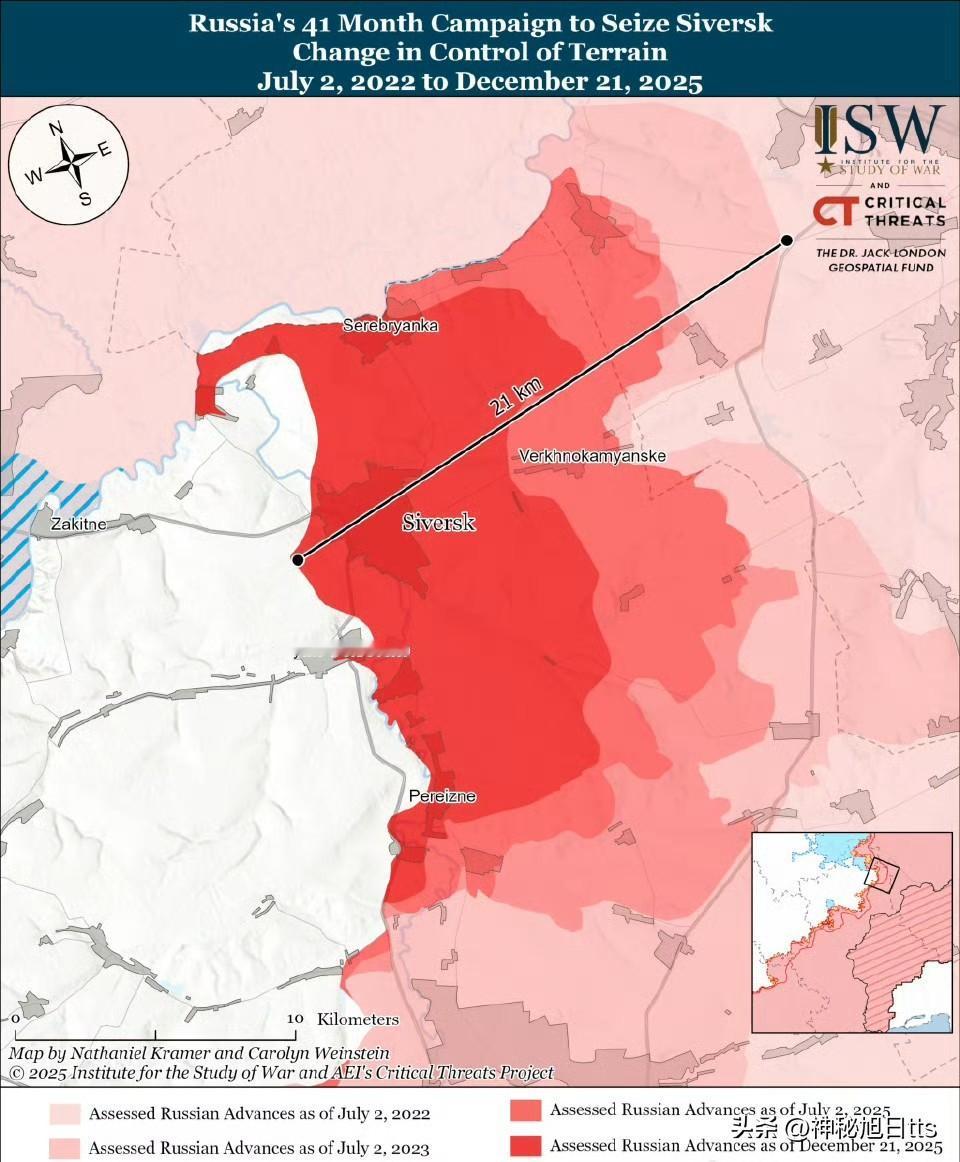 经过41个月的战斗,俄军可能已经占领了锡韦尔斯克——这座战前人口不足11000的城镇。乌克兰军事观察员马绍韦茨于12月21日报告称,俄军完成了对锡韦尔斯克的占领,并推进至锡韦尔斯克西部和西北部的高地,抵达了锡韦尔斯克西部的白垩采石场。马绍韦茨还报告称,自2025年11月中旬以来,俄军还在斯维亚托-波克罗夫斯克以北取得了战术进展,并占领了费多里夫卡和瓦休基夫卡(均位于锡韦尔斯克西南部)。克里姆林宫声称俄军于12月11日占领了锡韦尔斯克,此后俄罗斯总统普京和俄罗斯高级国防官员一直利用占领该镇来宣扬乌克兰防线正在崩溃、俄军有能力立即威胁斯拉维扬斯克的虚假叙事。俄罗斯在锡韦尔斯克方向的推进行动极其漫长,尤其考虑到锡韦尔斯克面积仅约10平方公里,战前人口约11000人。俄军花了41个月的时间才从利西昌斯克(锡韦尔斯克以东)推进约12公里到达锡韦尔斯克的西部行政边界。乌克兰的抵抗极大地延缓了俄军在通往锡韦尔斯克的道路上的推进:据ISW评估,俄军于2024年10月9日占领了韦尔赫诺卡米扬斯克(锡韦尔斯克以东约4公里),于2025年2月23日占领了比洛霍里夫卡(锡韦尔斯克东北约10公里),于2025年8月16日占领了谢列布良卡(锡韦尔斯克东北约4公里)。ISW最早观察到俄军于11月18日进入锡韦尔斯克镇界的证据,表明俄军进入该镇后可能用了33天时间才完全占领该镇。俄军仍需从锡韦尔斯克推进30公里至斯拉维扬斯克,并完成对莱曼的占领,才能对斯拉维扬斯克本身发起直接进攻。克里姆林宫夸大了占领锡韦尔斯克的直接影响,试图将俄军描绘成即将威胁要塞带北部,并在整个战区同时取得重大进展,以至于前线即将崩溃。但事实上,俄军的进展依然缓慢而艰辛,与过去两年一样。