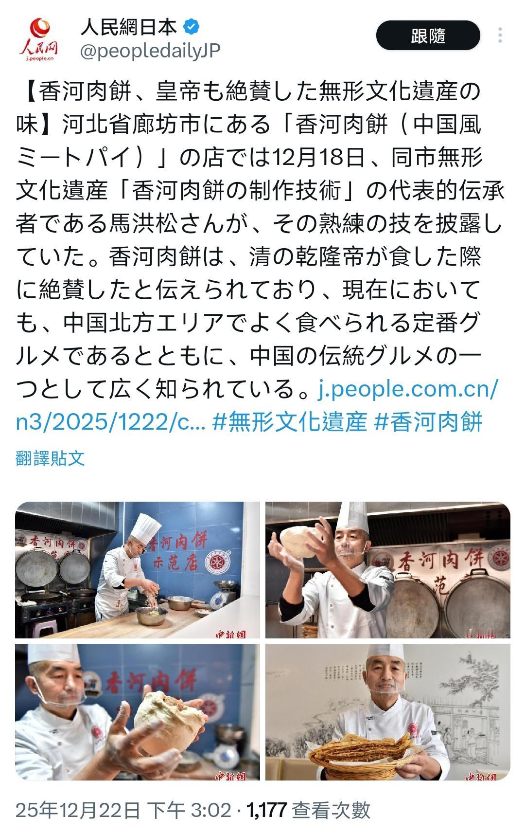 人日日文版今天介绍了香河肉饼! 香河肉饼,我一点不怀疑这的确是连皇帝都赞不绝口的非遗美食!我这样的人,没啥口腹之欲,也会对香河肉饼欲罢不能,实在是我在北京吃过的最好吃的饼类,吃过很多家,没有一家不好吃。像我这么刁的嘴,不太容易啊。 绝对比麻酱烧饼好吃太多太多了,烧饼太硬,会划嘴。香河肉饼,绝对是色香味俱全。喜欢烧饼的,千万别打我![耶][作揖] Source: X