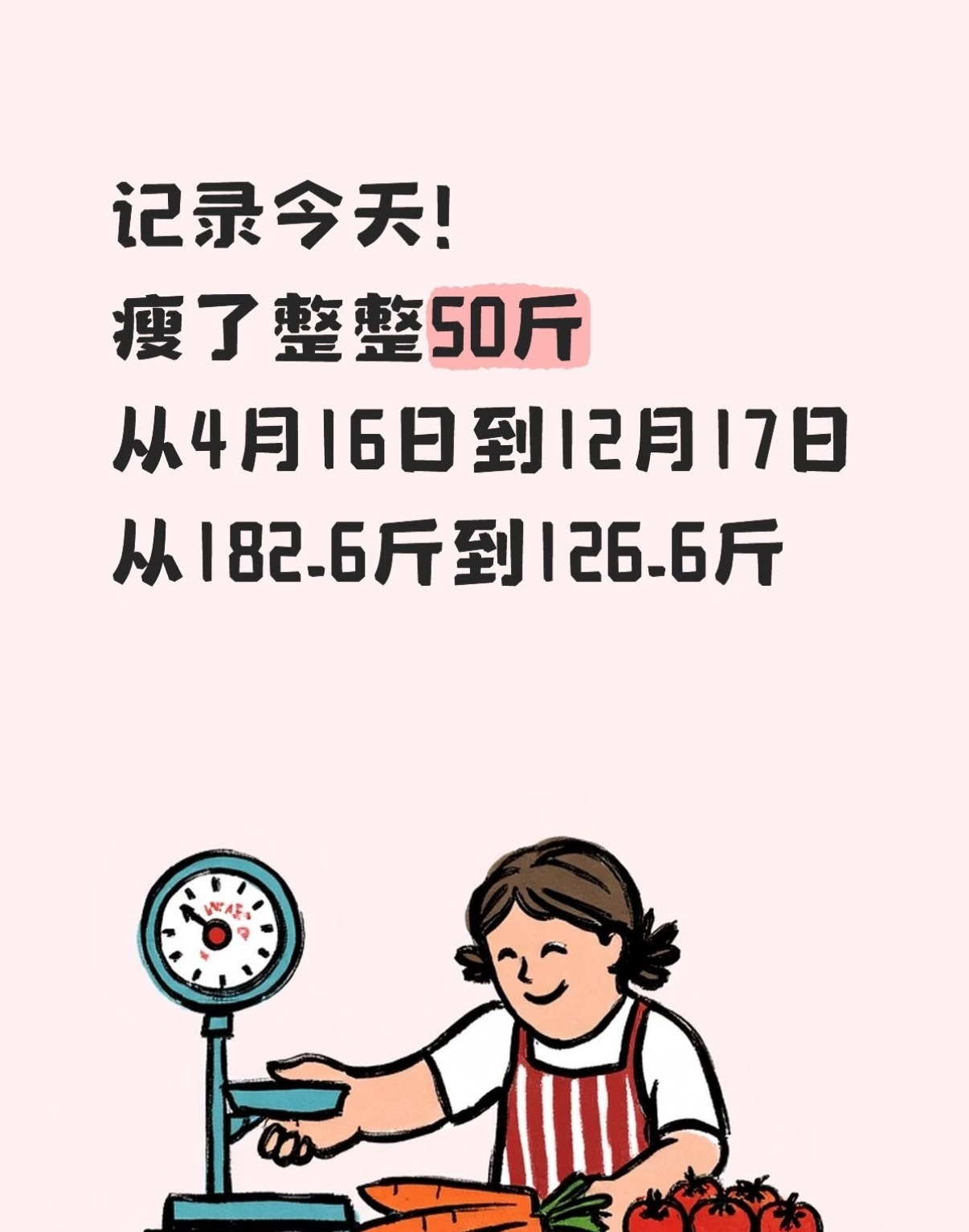 纯饮食减重50斤50斤的蜕变,我做到了!今天必须狠狠记录一下!从4月16日到12月17日,整整八个月的时间,我从182.6斤瘦到了132.6斤,实打实甩掉了50斤肉!说不辛苦是假的,那些戒掉奶茶火锅的日子,那些逼着自己爬起来运动的清晨,那些饿到嘴馋却咬牙忍住的瞬间,现在回头看,都成了最值得的坚持。原来真的没有什么不可能,只要敢开始、肯坚持,身体就会给你最诚实的反馈。这50斤不仅是体重的数字变化,更是我和自己的一场较量,而我赢了!