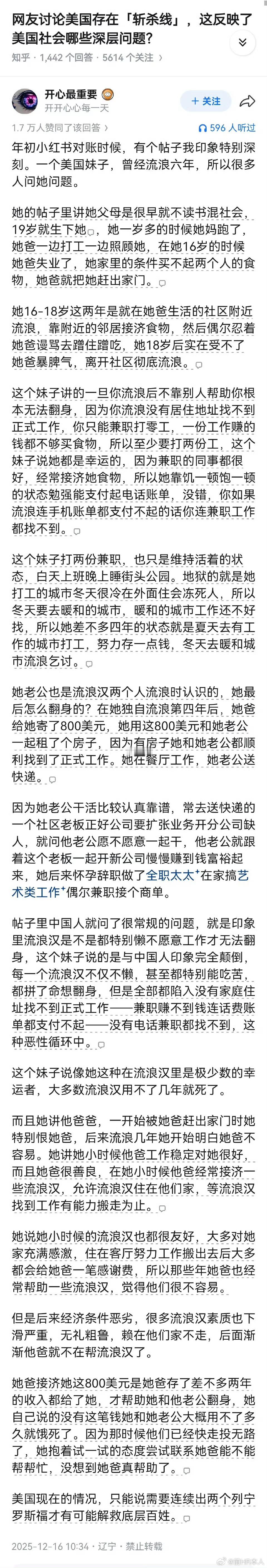 美国的斩杀线,太吓人了。吓人到,父亲要把女儿赶出去流浪,家里养个孩子都养不起的地步。吓人到,流浪汉平均生命就5-6年,不是饿死就是冻死。这是一个人吃人的社会啊。这么富有却让一些人被社会灭杀。