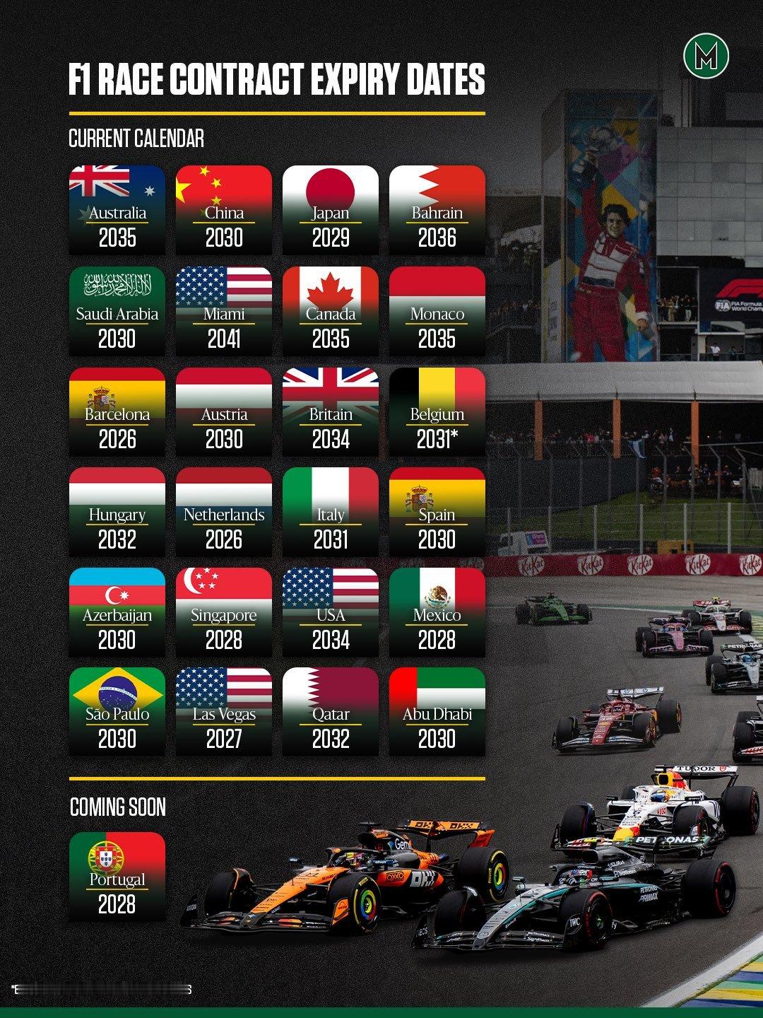 各条F1赛道合同到期的年份,其中巴塞罗那和赞德沃特2026年到期F1f1
