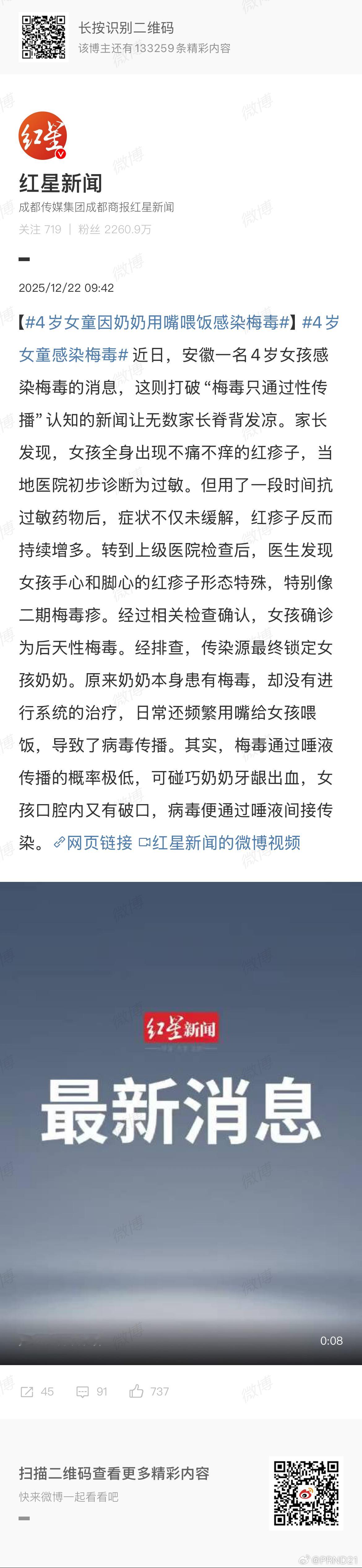 4岁女童因奶奶用嘴喂饭感染梅毒 得了梅毒却不规范治疗、长期嚼饭喂幼儿、牙龈出血估计牙周情况也不咋地,真tm是负面buff叠满了……所以说甭说什么“长辈育儿经验丰富”,这事儿要辩证地看,有些的确是经验丰富,有些陋习一筐、自己的死活都搞不明白、只是之前养的恰巧没死而已……梅毒现在可彻底治愈,但痕迹基本上永远能查出来,小孩儿将来传染病史、确证实验、解释成本这块要复杂不少……
