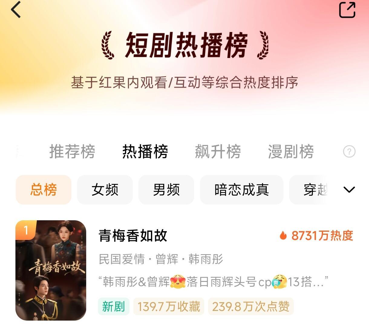 韩雨彤曾辉《督军如此多娇》改名《青梅香如故》红果已重新上架,热度破8000万,