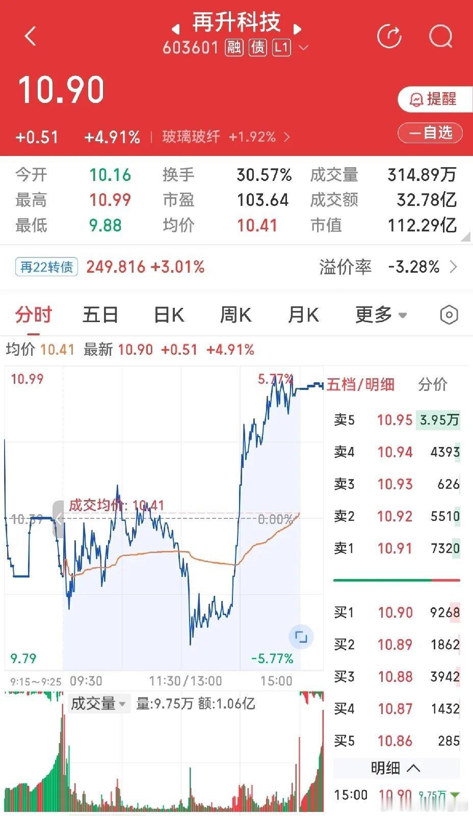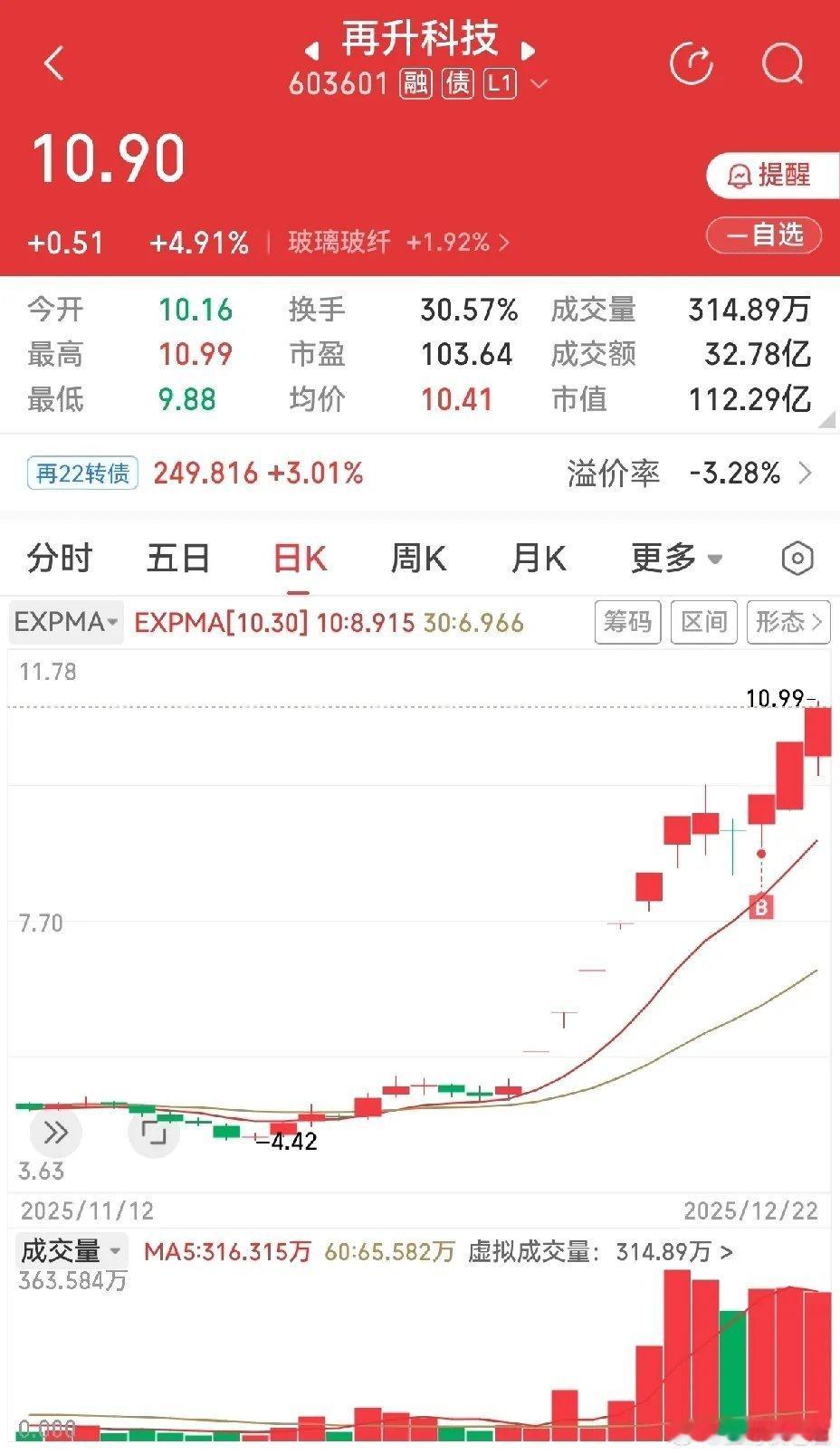 好多人都关心再升科技的走势,我也一样。主力今天控制得蛮好,上天说了不超过5%的涨幅,就不会管理。今天上午一直没涨,中午还跌了,我觉得就这样也不错,哪知道下午近两点时有人坐不住了,开始进场,而且上升势头较快,有点担心。如果没有节制,无脑冲的话容易越线。到尾盘看,股价10.90,涨幅是4.91%,悬啊,多一分钱就过界了。尾盘集合竞价我一直在看,有买单在抢筹,估计多数可能是散户在抢筹,价格一度抬到10.92,这样收盘的话就越线了,但是在收盘那一刻,主力抛出压单,将收盘价维持在10.90元,涨幅仍然是4.91%。高手,佩服!那么,新的问题又来了,明天呢?我大概算了一下,这里就说结论,简单一点。四个方面结合起来看:10日偏离值不超过100%、30日偏离值不超过200%、三日涨幅不超过20%,10日内异动次数已经三次不能超过四次,这四项里面有一项越线,都可能被管理。通过比较得出结论,涨幅不超过5.6%,收盘价在11.51以内安全。炒股真不容易,还要学会算计。也不知道算的对不对?敬请高手指教。特别提醒:贴图欣赏,并非推荐,据此操作,风险自担。✦✦✦本人仅此一号,无微信群,无公众号,不主动加人,主动加人者是骗子。请提高警惕,否则损失自负。✦✦✦