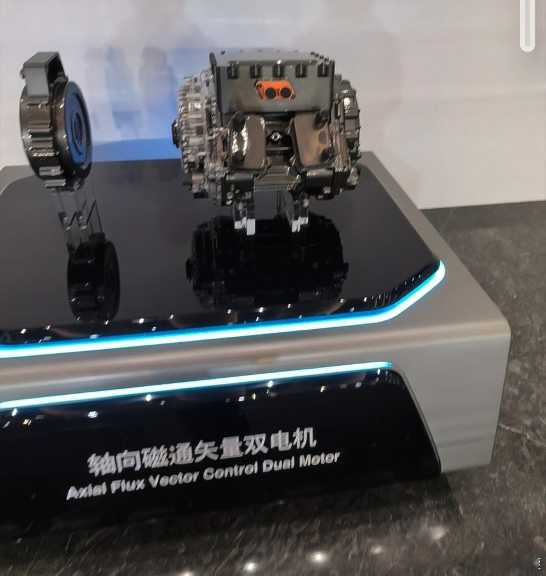 奇瑞的轴向磁通矢量双电机,说来就来了。你看这个尺寸,多小啊,单电机就是左边那个博饼,放轮毂里,没问题吧?这才是电车的未来,真正的驱动电机在轮毂里直接驱动,这是100年前保时捷老爷子的愿望。