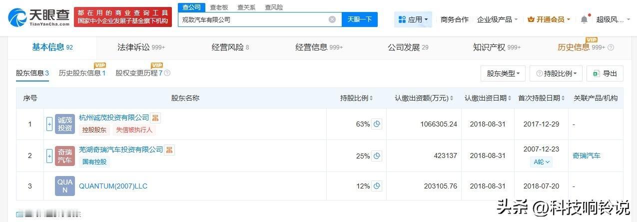 【观致汽车被申请破产审查 观致汽车新增破产审查案件】 天眼查天眼风险信息显示,12月22日,观致汽车有限公司新增一则破产审查案件,申请人为深圳欣本供应链有限公司,经办法院为江苏省苏州市中级人民法院。 观致汽车有限公司成立于2007年12月,法定代表人为何华,注册资本约169亿人民币,经营范围包括观致品牌机动车辆的生产、销售等。股东信息显示,该公司由杭州诚茂投资有限公司、芜湖奇瑞汽车投资有限公司、QUANTUM(2007)LLC共同持股。 天眼查信息: