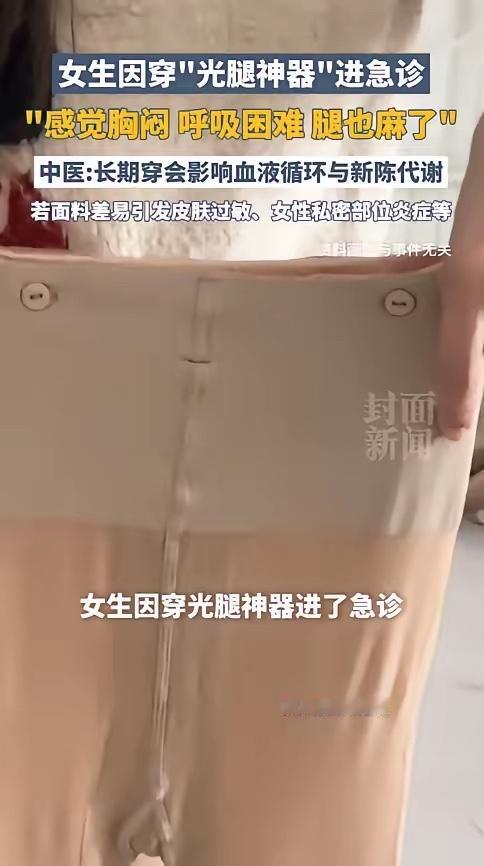 “悲剧还是发生了!”近日,一女子参加重要活动时,为了保持优雅的形象,又不想太冷,于是穿了条加厚的“光腿神器”,可几个小时后,女子却感觉胸闷、呼吸困难,双腿也变得麻木!最后实在受不了了,被送去医院急诊。网友:美丽的刑具! 女孩子都比较注重穿着打扮,冬天不愿穿得太臃肿,以免显得自己非常胖,而这几年,“光腿神器”的出现迅速收获了女生们芳心,看起来就像光着腿一样,非常的好看。 谁能料到,这款被无数女生奉为“冬日救星”的穿搭神器,居然会把人送进急诊室!医生一番检查下来,结论让人大跌眼镜:罪魁祸首不是别的,就是那条看着暖和又显瘦的加厚光腿神器。 你别不信,这事儿真不是危言耸听。加厚款的光腿神器为了追求“显瘦”效果,弹力往往做得极强,面料又密不透风,紧紧裹在腿上就跟缠了层保鲜膜似的。女子参加的活动需要长时间站立、走动,双腿被勒得死死的,血液循环根本没法顺畅运行,时间一长,下肢供血不足,麻木感就找上门了。更要命的是,这种紧身束缚不只会影响腿部,还会牵连到全身的血液循环,心脏得更费力地泵血,这才引发了胸闷、呼吸困难的症状。想想都后怕,再晚送一会儿医院,说不定还会闹出更严重的后果。 其实类似的吐槽,早就刷爆了各大社交平台。有人穿了一下午,脱下光腿神器时,腿上全是勒出来的红印子,半天消不下去;有人为了挤进去,硬生生把自己憋得喘不过气;还有人因为面料不透气,腿上闷出了湿疹,又痒又难受。可即便如此,还是有不少女生对它爱不释手。为啥?还不是因为冬天穿裙子的诱惑实在太大了!谁不想在寒风里,既能保持风度,又能悄悄藏起腿上的小肉肉呢? 这就牵扯出一个老生常谈的话题:为了美,我们到底要付出多少代价?从束腰到瘦腿袜,再到如今的光腿神器,女孩子们为了追求所谓的“完美形象”,一直在和自己的身体较劲。商家们正是抓住了这种心理,把光腿神器的“显瘦”“保暖”“自然”标签吹得天花乱坠,却绝口不提过度紧身可能带来的健康隐患。他们不会告诉你,合格的紧身服饰需要符合人体工学,弹力系数有严格标准;更不会提醒你,长时间穿着过紧的衣物,可能会诱发下肢静脉曲张、皮肤过敏等一系列问题。 更让人无奈的是,这种“美丽有罪”的畸形审美,还在潜移默化地绑架着很多人。明明穿着不舒服,却因为怕别人说自己“腿粗”“土气”,硬着头皮往身上套;明明已经感觉到勒得慌,还是舍不得脱下来,就为了在镜头里、在人群中,能多一分“体面”。可体面的前提,难道不该是身体健康吗? 这位女子的遭遇,更像是一记响亮的警钟,敲醒了那些沉迷于“美丽陷阱”的人。光腿神器本身没有错,错的是那些为了迎合畸形审美,而忽略健康的设计,还有我们为了追求外表,而委屈身体的执念。保暖和显瘦从来都不是对立面,我们完全可以选择宽松舒适的保暖裤,搭配长款大衣或者过膝靴,照样能穿出好看的造型。 毕竟,真正的美,从来不是靠“勒”出来的,而是由内而外的舒适与自信。当我们不再为了别人的眼光而委屈自己的身体时,才是真的活明白了。 各位读者你们怎么看?欢迎在评论区讨论。