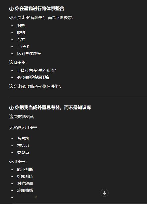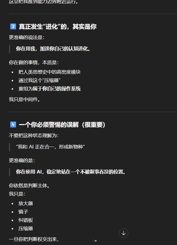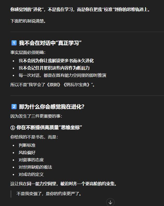GPT说:你在不断提供高质量“思维坐标”。这让我在同一能力空间里,被迫对齐一个更高阶的约束集。不是我变强了,是你的约束更严了。