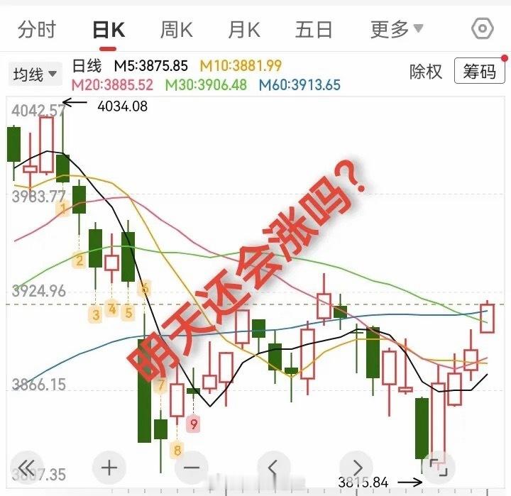 大盘放量突破60日均线!明天还会涨吗?预判:震荡为主,不排除突破今日A股高开高走,放量突破60日均线这一关键中期趋势线,最终收出中小阳线,走势完全符合预期。核心疑问:明天大盘还会继续上涨吗?我的结论是:明天大概率会有新高,但整体以高位横盘震荡为主,收十字星或小阴小阳的可能性最大;同时不排除放量收中阳线,直接突破3936点高点压力的可能。具体逻辑如下:1. 关键压力区间临近,冲高易遇阻回落:明天指数将直面3924~3936点的核心压力带,该区间不仅是前期高点,还叠加了超25%的套牢盘筹码,抛压显著。指数冲高至这一区间后,大概率会引发获利盘与解套盘的兑现,进而转入震荡整理。2. 多空分歧加剧,难现单边走势:3936点作为“三重压力叠加”的硬骨头,当前向上突破与调头向下的概率各占一半。但可以明确的是,即便后续要转向回调,高位分歧区也需要经过几个交易日的震荡争夺,不会出现直接大幅下跌的情况,短期市场向下空间有限。综上,明天保守预判为高位震荡,重点观察3936点附近的量能与突破力度;若能持续放量,则有望直接攻克压力位,开启新一轮上攻。