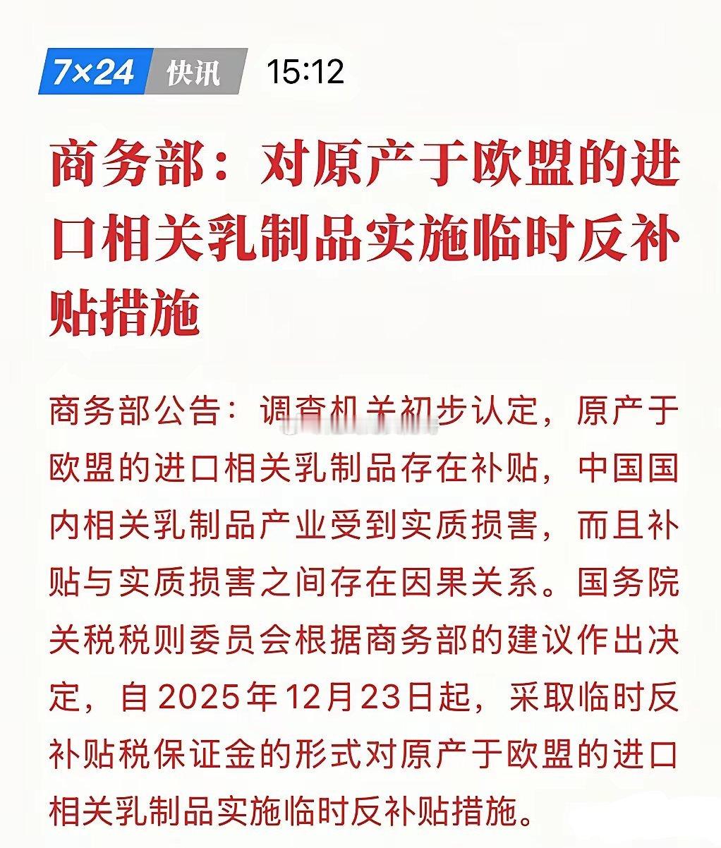 商务部出手!对欧盟乳品将加税21.9%~42.7%,国产乳业迎重磅利好!刚刚,商务部官宣,原产于欧盟的相关乳制品存在补贴,已对中国产业造成实质损害,自2025年12月23日起,中国将对这些产品征收21.9%–42.7%的临时反补贴税保证金。可以预期,来自欧盟的奶酪、稀奶油、黄油等进口成本一夜暴涨;国内食品厂、烘焙店、连锁餐饮被迫转向国产替代。过去,欧盟靠政府补贴低价倾销,国产高端乳品打不过。如今,国家出手筑墙护产,直接为民族品牌腾出市场空间,这不仅是贸易反制,更是产业扶持。当前,奶酪行业年增速超20%,但国产化率仍不足40%,这次关税大棒,或将成为国产替代加速的转折点。