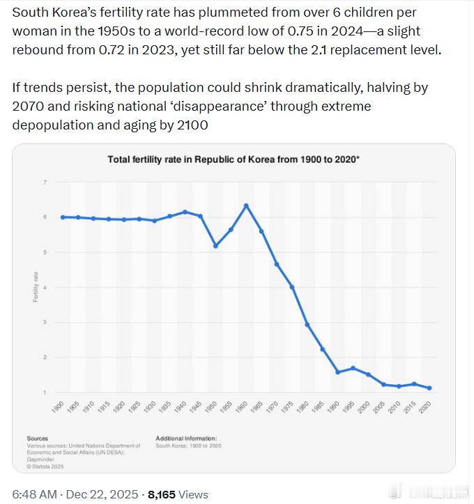 韩国的生育率已从20世纪50年代每名女性6个以上孩子,暴跌至 2024年的0.75,创下全球最低纪录——虽然较2023年的0.72略有回升,但仍远低于2.1的人口更替水平。如果这一趋势持续下去,韩国人口可能会出现断崖式萎缩:到2070年或将减半,并在2100年面临因极端少子化和严重老龄化而导致的国家“消失”风险。