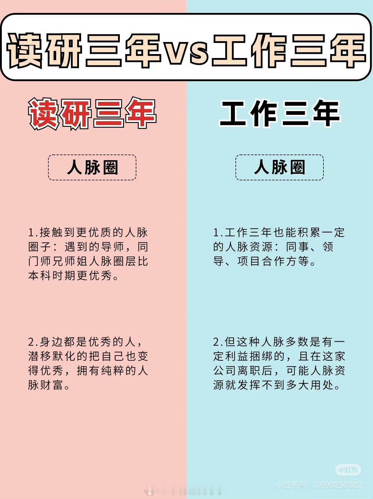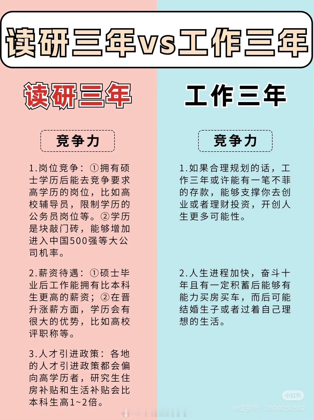 读研3年vs工作3年 读研三年和工作三年哪个更值?这个问题,真正纠结的从来不是“钱”,而是时间被用在了哪里。三年研究生,看起来是在“延迟就业”;三年工作,看起来是在“提前兑现”。但如果把时间拆解成三个维度。认知密度、能力复利、人生选择权,结论会比“月薪多少”更清晰。读研三年,值不值,取决于你有没有“研究生式成长”很多人低估了读研的真正价值,也有人高估了它的“光环”。读研真正值钱的,从来不是那张文凭,而是三件事。系统性思考能力。你第一次被要求把一个问题拆到最底层,再用逻辑、数据和方法论重建它。延迟满足能力。实验失败、论文反复、结果不可控,这是现实世界极少给年轻人的训练。认知天花板的抬升。你会发现世界并不是“会干活就行”,而是“谁定义问题,谁拥有话语权”。但反过来说,如果三年只是“混课题、拖毕业、躲就业”,那它确实不值,甚至比直接工作更亏——因为你既没积累行业经验,也没形成稀缺能力。读研不是避风港,它是放大器。努力的人被放大,摆烂的人也被放大。工作三年,真正拉开差距的不是岗位,而是“轨迹”很多人以为,工作三年就是三年经验。但现实是有人三年经历了0→1→独立负责有人三年只是在同一张表格上按了1000次回车工作三年真正值钱的,不是工龄,而是三条曲线1. 能力是否指数型增长2. 是否进入一个有成长斜率的行业3. 你是被替代的执行者,还是不可替代的节点如果三年里,你逐渐拥有判断力、资源、影响力,那你很可能已经超过了大部分“只靠学历起跑”的人。但如果只是“稳定、不出错、可随时替换”,那三年后你会发现,自己和刚毕业时相比,只是更疲惫了一点。真正的分水岭:三年后,你有没有“选择权”把问题换一种问法,答案会更残酷也更真实三年后,你能不能换赛道、换城市、换生活方式?读研三年后,有些人能进入更高认知密度的行业,有更低的试错成本工作三年后,有些人已经被房贷、岗位、路径牢牢绑定值不值,取决于你三年后是更自由,还是更被锁定。一个更现实的结论如果你目标明确、专业壁垒高、需要学历背书,那么读研往往是捷径如果你行动力强、行业窗口期短、实践价值远大于理论,那就尽早工作更划算最糟糕的选择是读研却不深度投入工作却不主动升级时间不会奖励“看起来很努力”的人,只会奖励“持续积累复利”的路径。最后一句很扎心的话三年不会自动变值钱。值钱的从来不是“读研”或“工作”,而是你是否在用这三年,构建一个五年、十年后仍然有效的自己。这,才是这个问题真正该被讨论的地方。你觉得呢? 青岛
