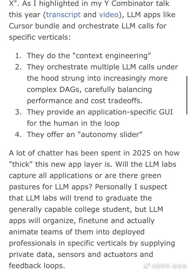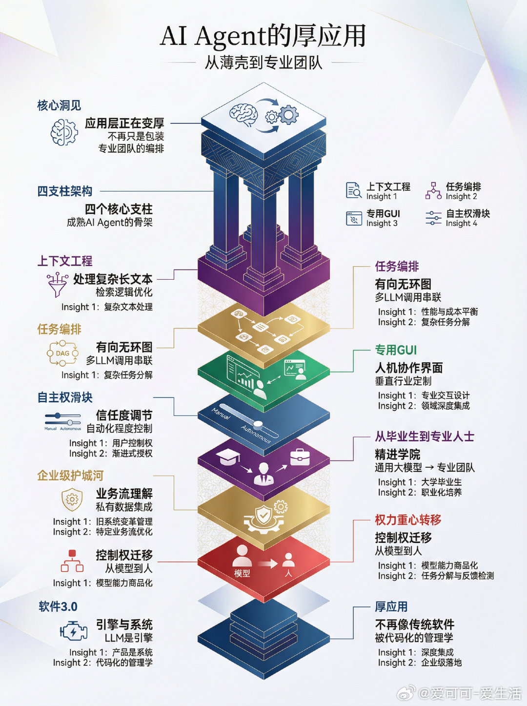 关于 AI Agent 的未来,Andrej Karpathy 最近分享了一个深刻的洞察:LLM 应用不再仅仅是模型的包装,而是通过私有数据、传感器和反馈闭环,将模型编排成垂直领域的“专业团队”。Aaron Levie 对此补充道,AI 应用层正在变得前所未有的“厚”。过去两年,人们常批评 AI 应用只是“薄壳包装(Thin Wrapper)”,但这只是技术初期的错觉。随着 AI 从对话框走向工作流,真正的价值正在向栈顶迁移。一个成熟的 AI Agent 应用通常包含四个核心支柱:1. 上下文工程:处理复杂的长文本与检索逻辑。2. 任务编排:将多个 LLM 调用串联成复杂的有向无环图(DAG),在性能与成本间取得平衡。3. 专用 GUI:为“人机协作”提供垂直行业的交互界面。4. 自主权滑块:允许用户根据信任度调节 Agent 的自动化程度。我们可以这样理解:通用大模型就像是一名极具潜力的大学毕业生,而优秀的 LLM 应用则是将其培养成专业人士的“精进学院”。在企业级市场,通用的横向平台往往难以落地。真正的护城河不在于模型的原始智商(IQ),而在于对特定业务流的理解、私有数据的深度集成,以及对旧系统的变革管理。这里的深度思考在于:当模型能力趋于商品化,权力的重心将转移到控制任务分解、反馈检测和故障处理的人手中。这层“厚应用”看起来不再像传统的软件,而更像是被代码化的管理学。软件 3.0 时代,LLM 是引擎,但产品是系统。x.com/levie/status/2002805101510197370
