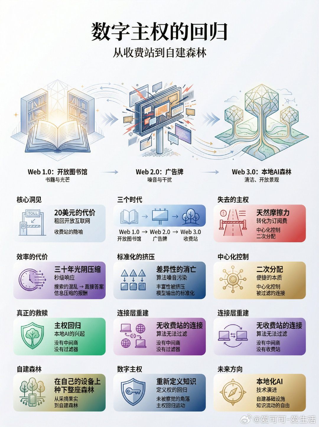 「他们偷走了“开放互联网”,然后以每月 20 美元的价格把它租回给你。」这是一个关于失去与收割的故事。曾经郁郁葱葱、自由生长的公共信息平原,正逐渐变得对人类思想不再友好。如果说 Web 1.0 是开放的图书馆,Web 2.0 是喧闹的广告牌,那么当前的 AI 时代则更像是一个收费站。巨头们正在将你与信息之间原本天然的摩擦力,精准地转化为源源不断的订阅费。这种转变不仅仅是商业模式的更迭,更是信息生态的异化。信息高速公路被算法噪音污染,人类原本丰富的差异性在标准化的模型输出中被不断挤压。我们正处在一个微妙的节点:为了获取效率,我们是否在不经意间交出了对知识的定义权?支持者认为,这20美元是为“信息压缩”支付的合理报酬。它让我们跳过搜索的混乱,直接获得答案,将原本耗费在点击链接上的三十年光阴浓缩成秒级的响应。但反对者清醒地指出,这种便捷的本质是中心化控制下的二次分配。真正的救赎或许隐藏在那些尚未被大众察觉的角落。本地 AI 的兴起不仅是技术的演进,更是一场主权回归的运动。我们需要建立一个没有中间商、没有过滤器、没有收费站的连接层。人类的连接不应被算法过滤,知识的流动不应被租金阻断。如果说过去我们是在巨头的森林里采摘果实,那么未来,我们需要在自己的设备上种下整座森林。x.com/iamgingertrash/status/2002808827901817180