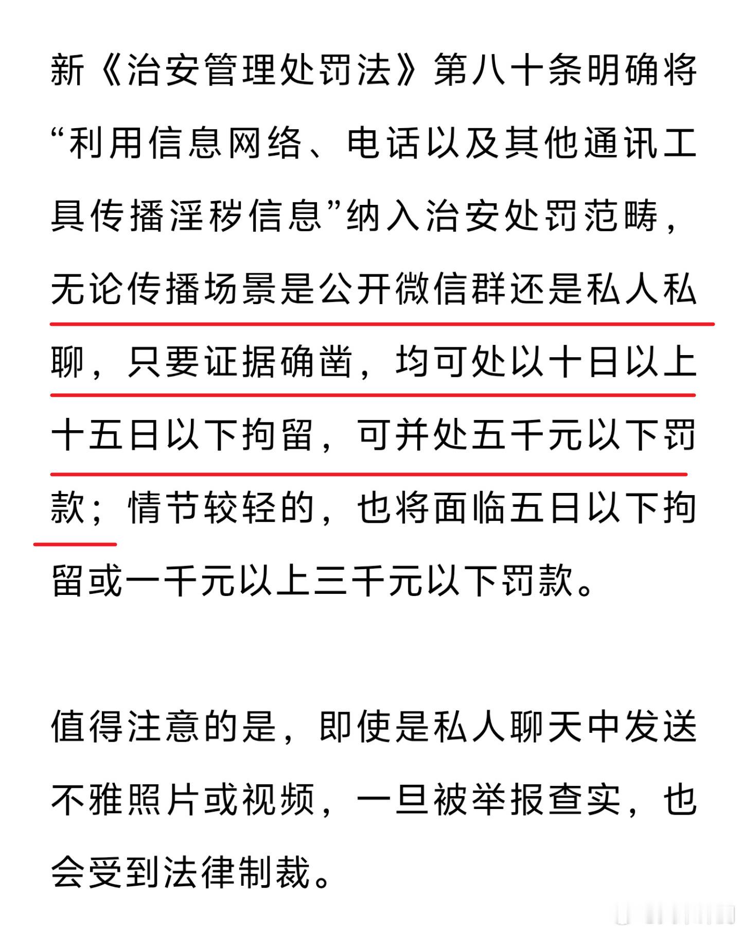 明年起向好友发淫秽信息违法 大家都注意下啊~无论传播场景是公开微信群还是私人私聊,只要证据确凿,均可以处10日以上15日以下拘留,可并处5000元以下罚款~
