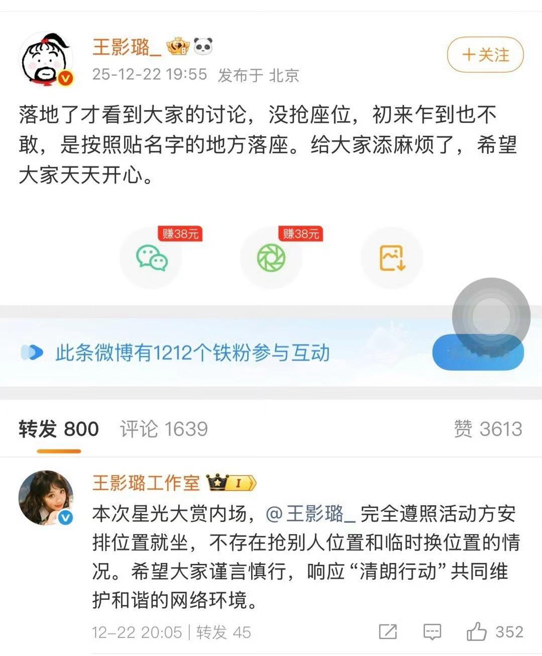 网传王影璐和丞磊抢座位,王影璐回应了!王影璐 没抢座位
