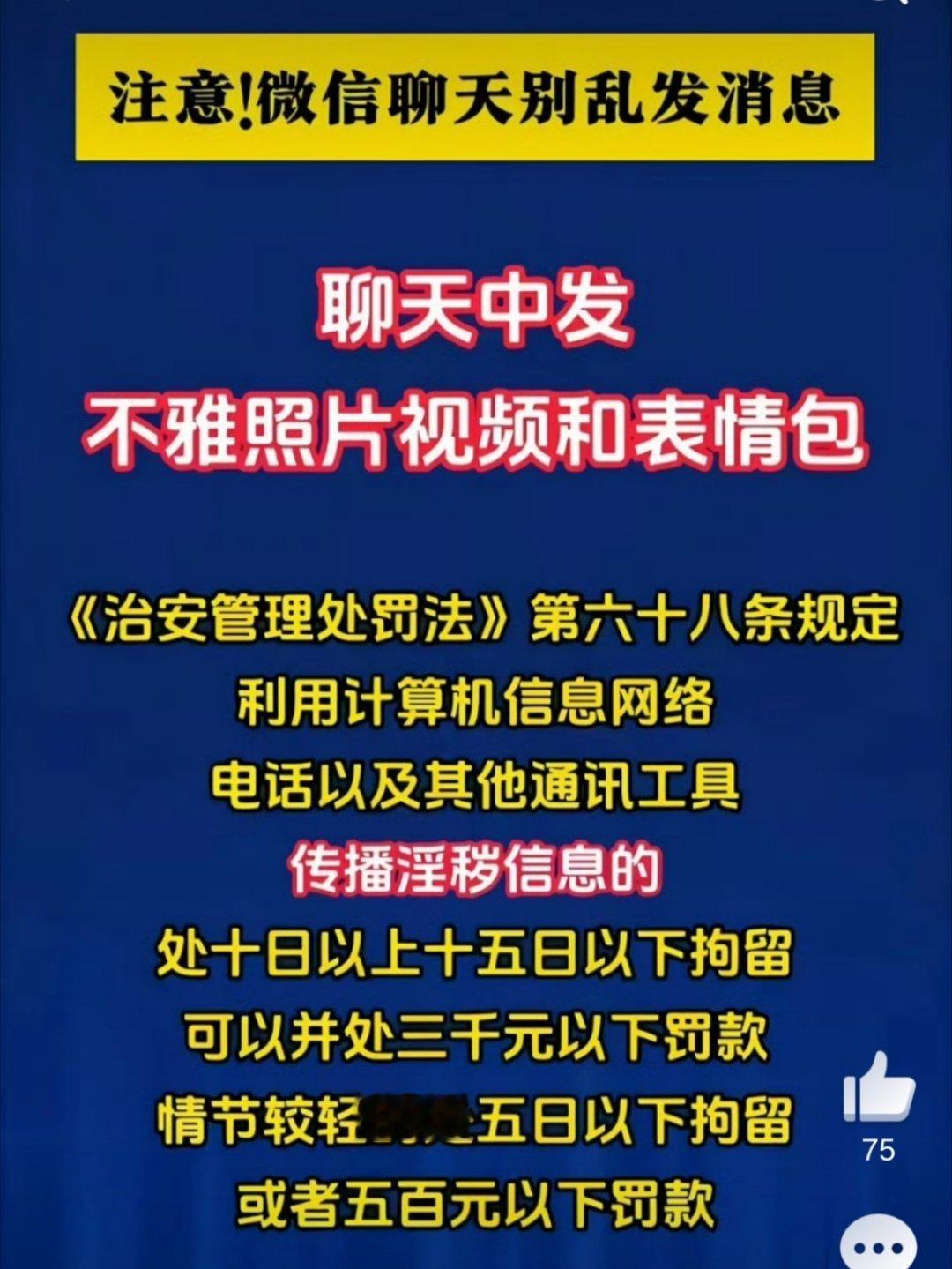 微信转发淫秽信息给好友也违法我最好奇的还是这个不雅表情包,这范围可大了去了,总不能以后看看腿或者看看腹肌也不行吧,还有异地男女朋友调情发点小图片,这也得罚款?