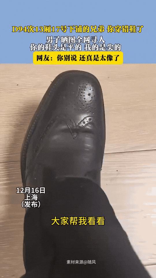 笑不活了!上海一男子坐动车卧铺回家,到站后走路总觉得脚不得劲,低头一看傻眼了——两只鞋压根不是一对!一只鞋头平平,一只鞋头尖尖,这才反应过来,准是被下铺乘客下车时穿错了一只!网友乐翻:你还别说,这鞋乍一看真看不出来差别! 事情是这样的,男子老家突然来电话,说家里有孩子要定亲,想让他回去帮忙撑场面。男子立马跟公司请假,买了张动车卧铺票就出发了。 他买的是上铺,上车放好行李后,就脱鞋上床休息。前几天加班太累,他躺下没一会儿就睡着了。不知过了多久,他被一阵嘈杂声吵醒,原来是到了中途站,乘务员在催到站的乘客下车。 一听不是自己要下的站,男子翻了个身准备接着睡,隐约听见下铺的男乘客咳嗽了几声,随后传来穿鞋、拖行李箱的动静。他想着跟自己没关系,就又沉沉睡了过去。 等再次醒过来,差不多就快到自己的目的地了。没几分钟,乘务员就报站提醒下车,男子赶紧爬下床、穿好鞋,推着行李箱就下了车。 一开始他没觉得有啥不对,可走出火车站没多远,总感觉一只脚不得劲。起初他以为是坐车累的,没太当回事,直到到家准备换鞋,才猛地发现脚上的两只鞋根本不一样!粗看没啥差别,仔细瞧才发现,鞋头一个平一个尖,鞋面的花纹也不一样。 男子瞬间反应过来,肯定是在动车上穿错了!他转念一想,自己下车时,下铺早就没人了,床底下也没剩别的黑皮鞋。这才想起上车时,好像看到下铺地上摆着一双黑鞋,八成是下铺那哥们下车时穿错了一只,这才导致自己也跟着穿错了。 又好气又好笑的男子,把这两只“鸳鸯鞋”拍了照发到网上,还隔空喊话,希望那位穿错鞋的大哥能看到,主动联系他换回鞋子。 网友们看到后纷纷调侃,第一眼瞅着还以为是一双鞋,这差别也太不明显了!还有人说,这俩鞋除了鞋头和花纹不一样,鞋码、颜色、款式都差不多,妥妥的“兄弟鞋”,上铺下铺能穿错,这俩人的缘分和鞋品都没谁了! 动车穿错鞋名场面 年度社死现场