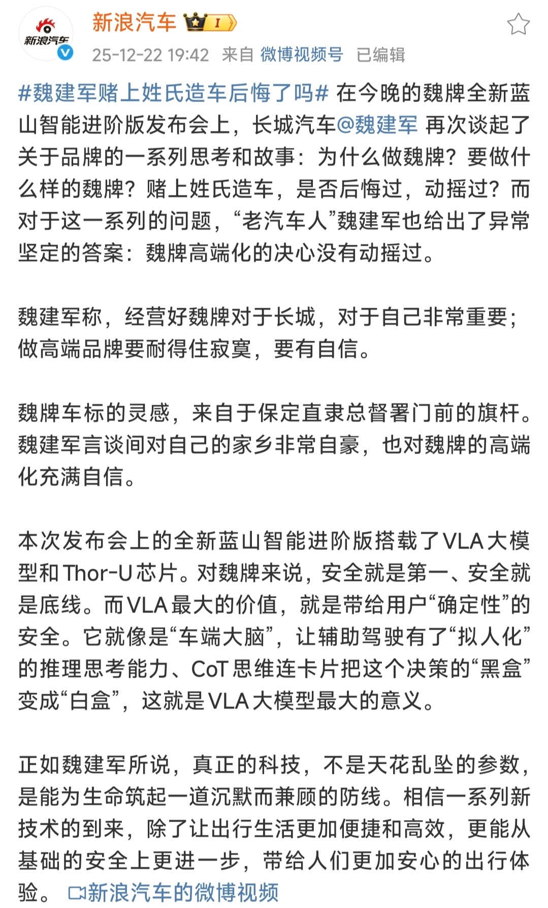 魏建军赌上姓氏造车后悔了吗大家发现了吗,只有超豪华品牌,才喜欢吹总部所在地,平民品牌不怎么吹。马拉内罗的法拉利,斯图加特的保时捷背后,是他们作为奢侈品,生产流水线是手工的,大量定制工艺是手工的,大量选配材质是特定产地的,历史故事是当地才有的,这是目标人群买这些车作为谈资的软实力。买菜车则不一样,特斯拉吹自己总部在加州超级工厂又怎样,全球绝大多数市场买到的特斯拉是上海产的,比亚迪吹自己总部在深圳又怎样,全球绝大多数市场买到的比亚迪是长沙,郑州,西安等工厂产的。买这些车的人关注的也主要是性价比,而非品牌的产地故事。WEY牌汽车拿保定的旗杆做logo当然没啥问题,保定有保定的自豪也没啥问题,但这些积淀反映在车上,还是差点。2018年WEY和领克一起冲上20万价格区的时候本来是自主品牌上攻的唯二新星,保定的自豪当然值得吹。但现在2025年了,问界极氪的50万级的车都能月销八千以上了,尊界百万级的车都能月销两三千了,并没有哪家飘到要拿产地出来大做文章的。如今,WEY的车型却还在上攻30-40万价格区,只能说上攻的路确实有必要坚持,可保定的话,还得再加加油。